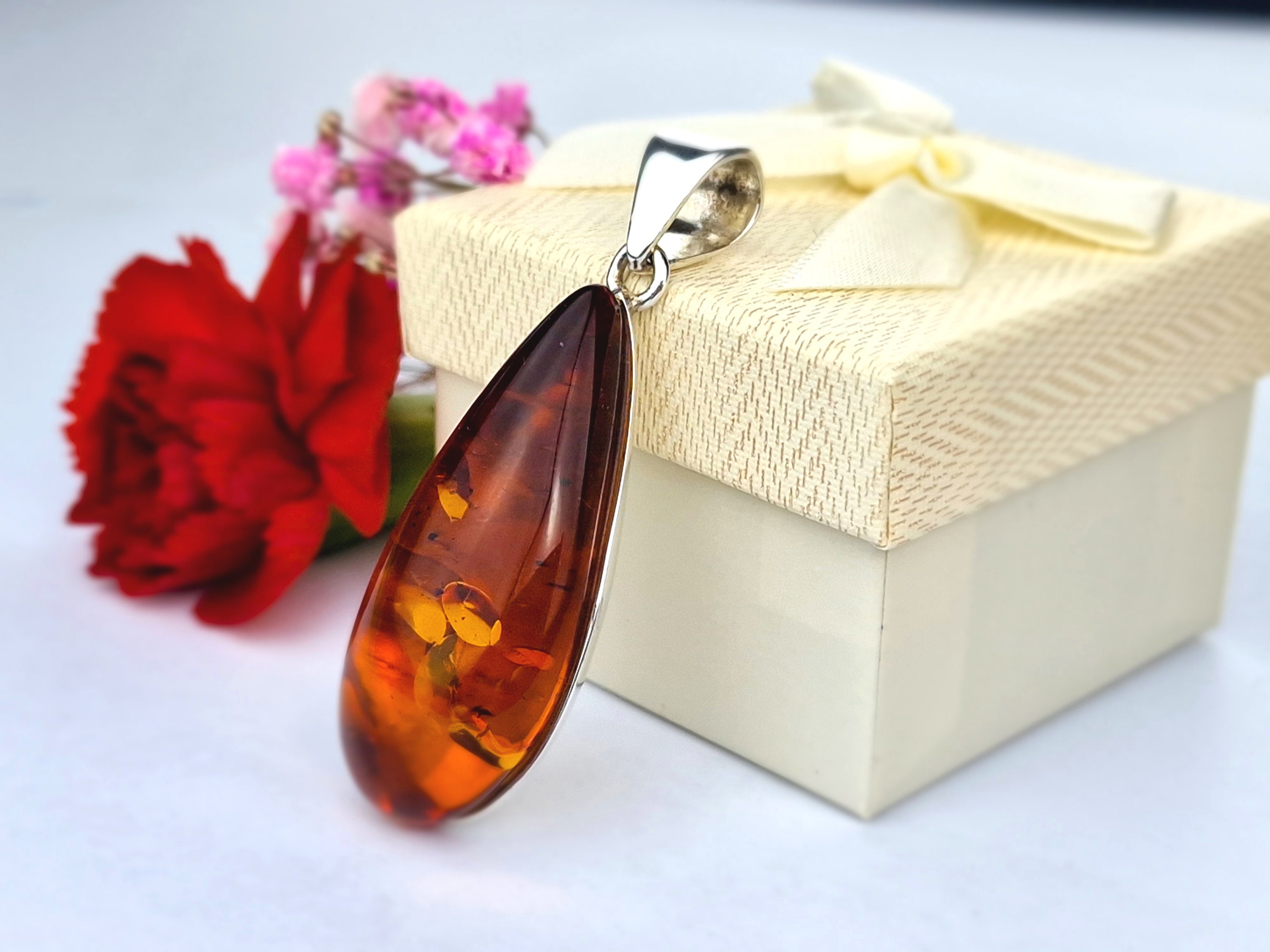 Dark Cognac Amber Drop Pendant, Natural Amber Gemstone Pendant, Baltic Amber Stone Pendant, Amber And Silver Pendant Jewelry, Amber Drop Gift.