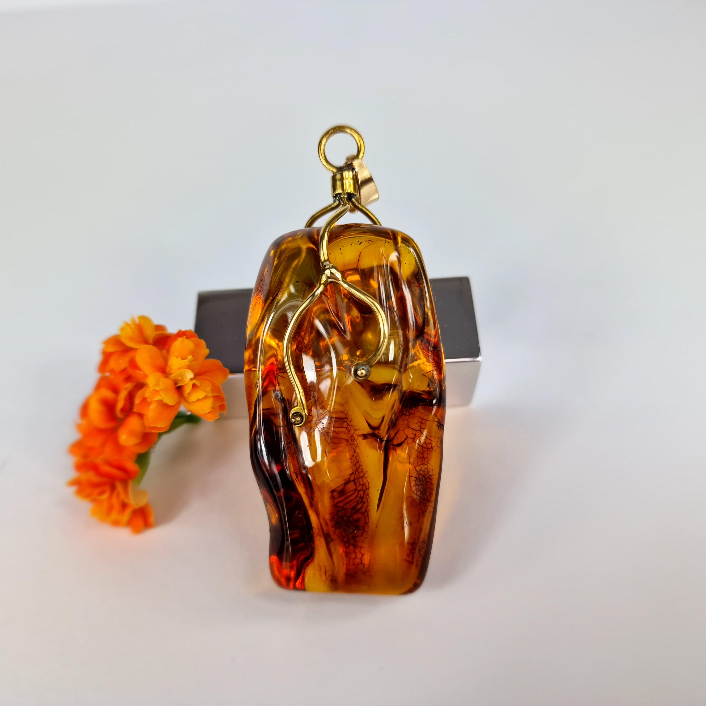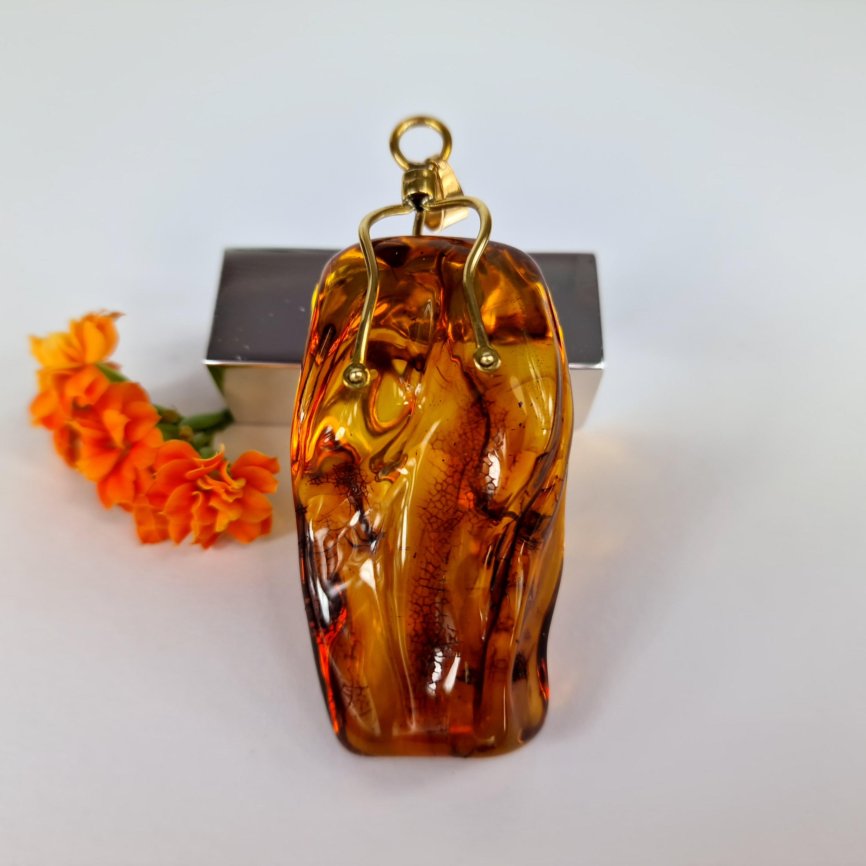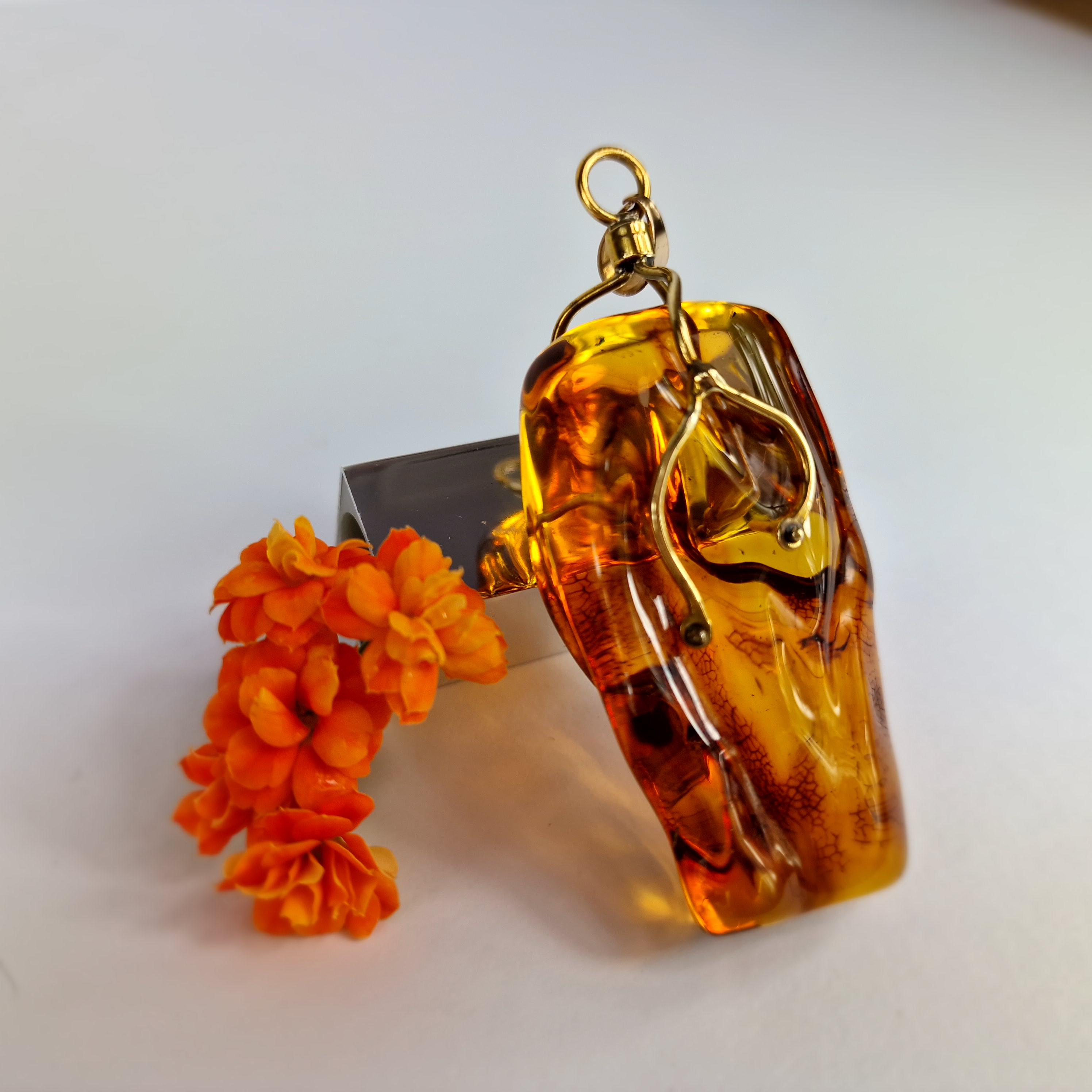 This is a large natural Baltic amber pendant. Cognac amber is framed in brass. The amber itself is slightly engraved, which gives the transparent amber charm. Such a pendant can be worn on a larger chain or on a hoop. It will suit those who wear gold or gold-plated silver best.