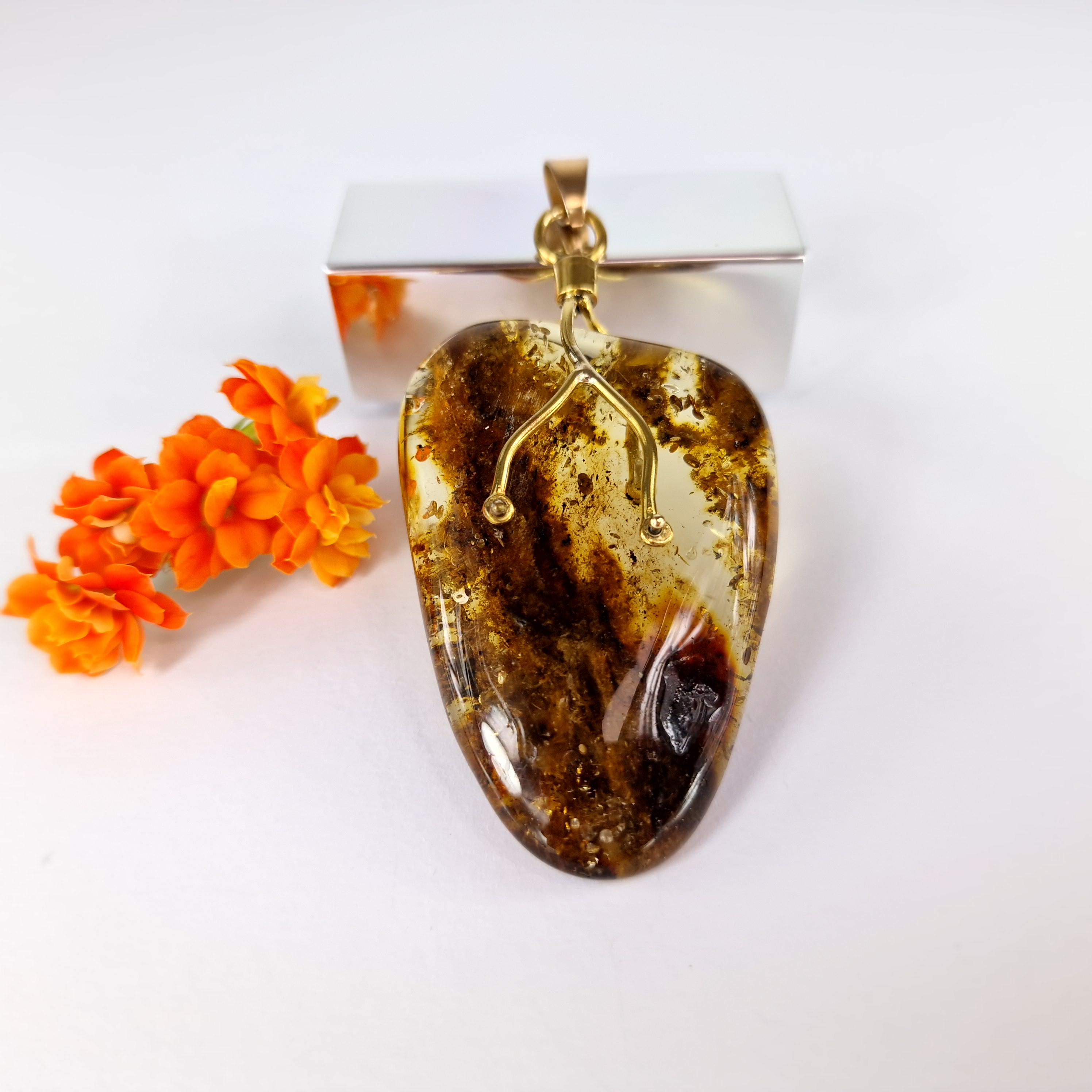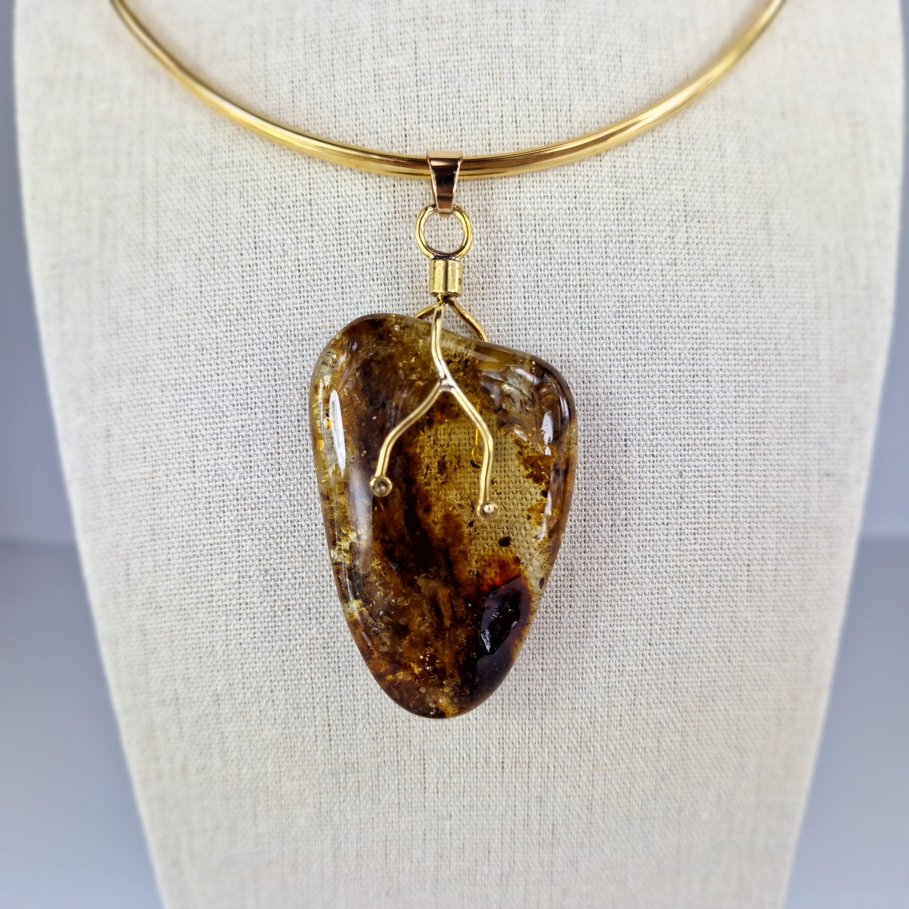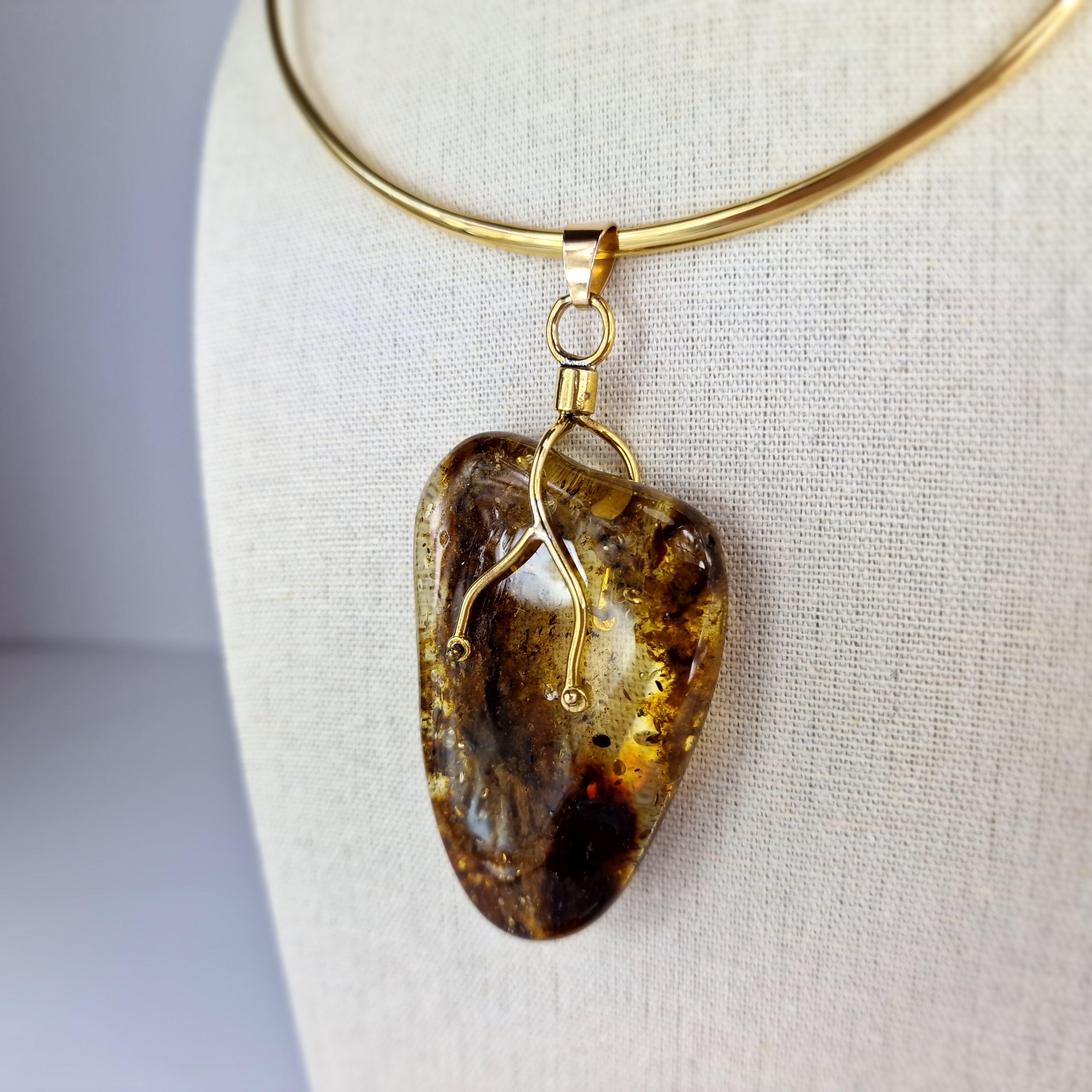 This is a large natural Baltic amber pendant. Algae and various grasses are visible in the transparent amber. The amber is framed in brass. This pendant can be worn on a larger yellow metal chain or on a solid hoop. It will suit best those who wear gold or gold-plated silver.