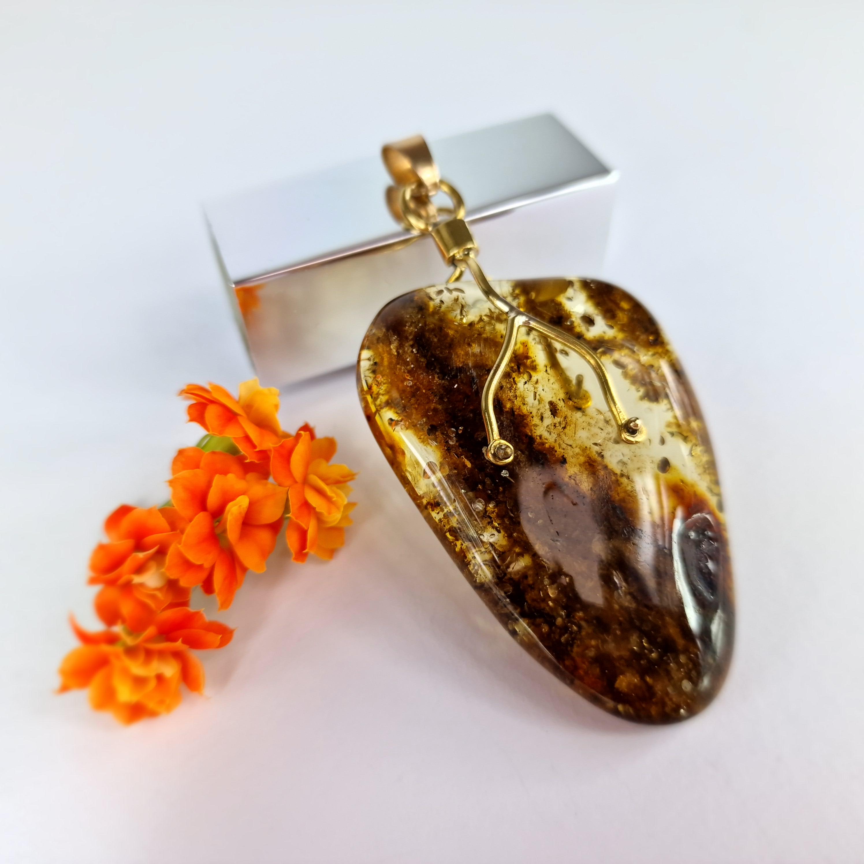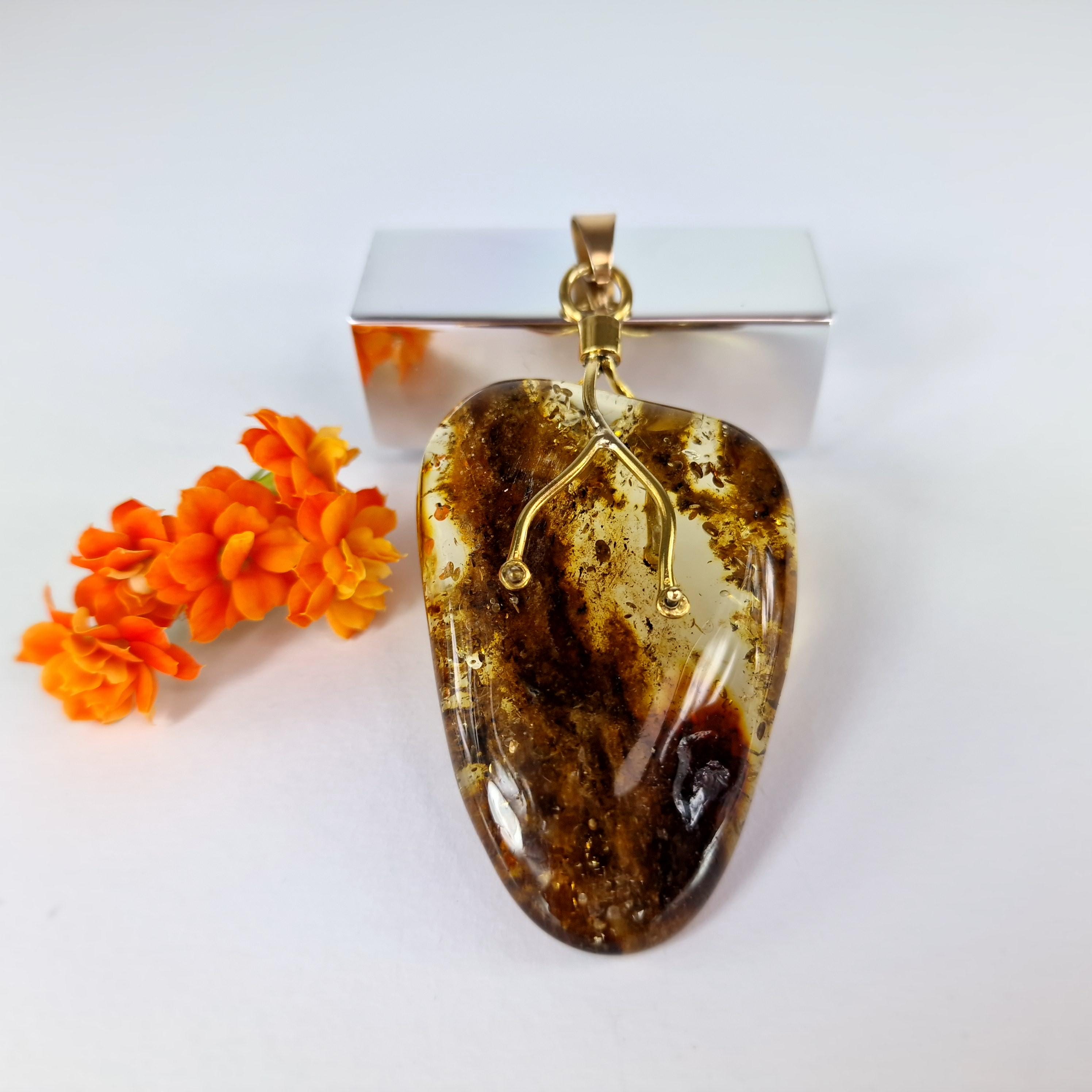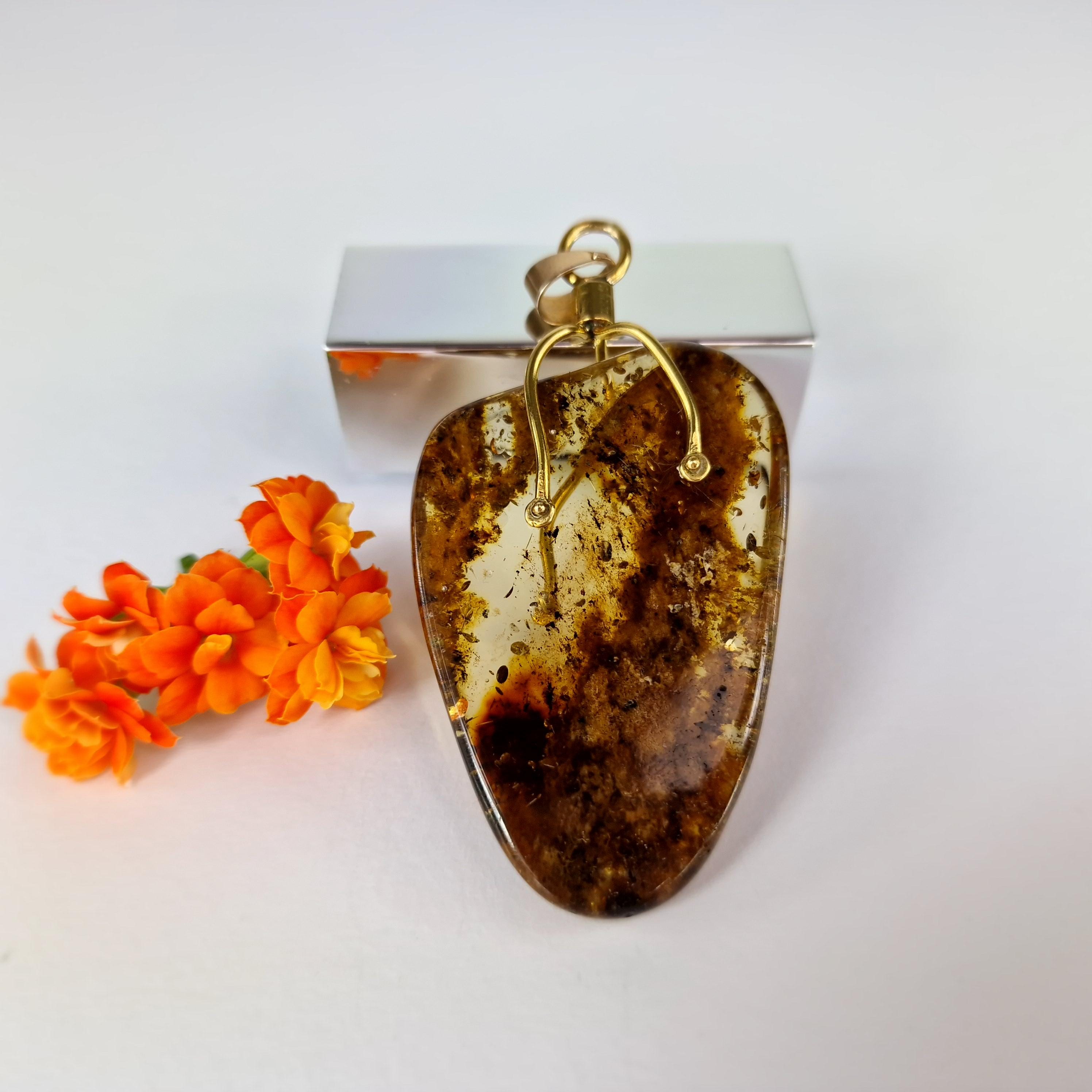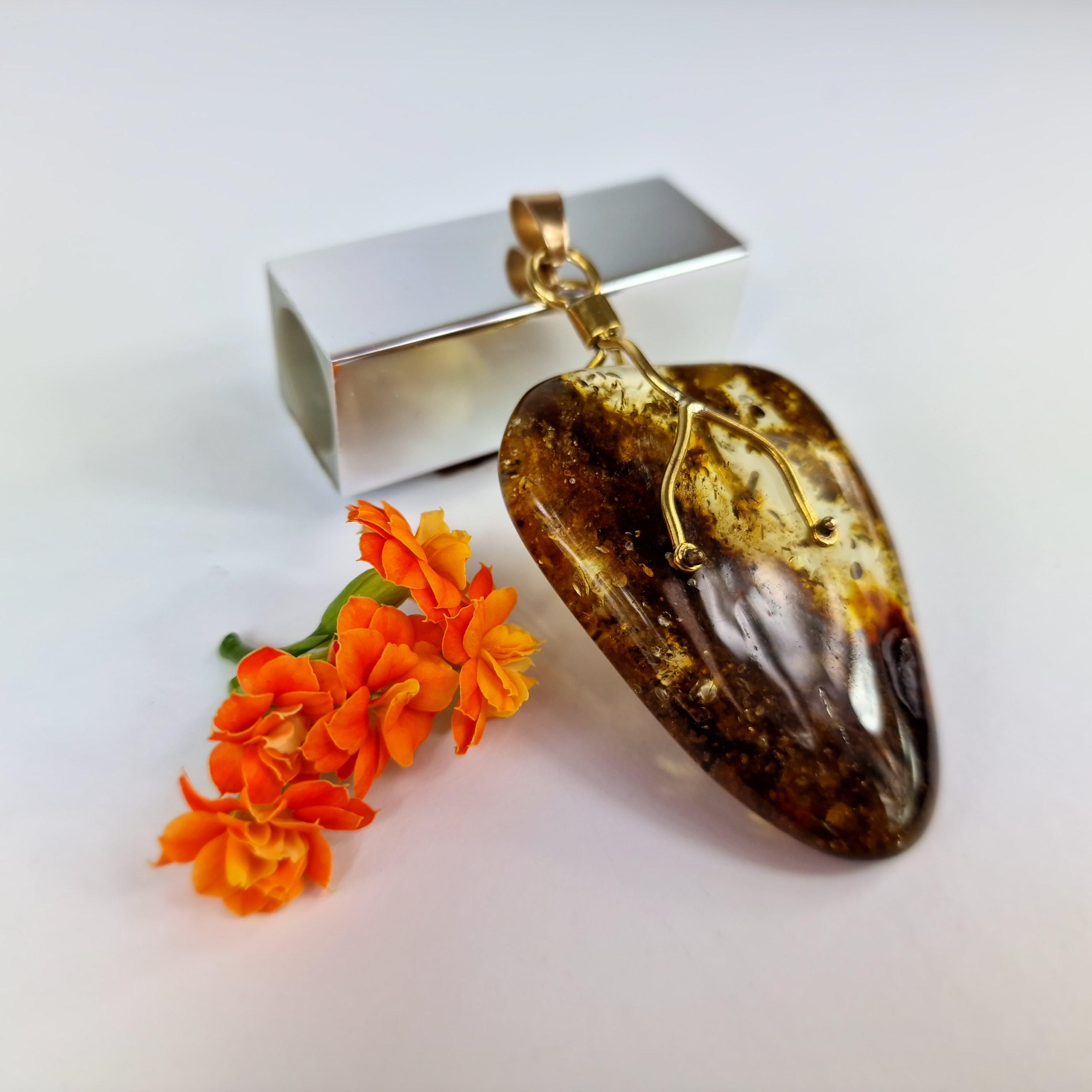 This is a large natural Baltic amber pendant. Algae and various grasses are visible in the transparent amber. The amber is framed in brass. This pendant can be worn on a larger yellow metal chain or on a solid hoop. It will suit best those who wear gold or gold-plated silver.