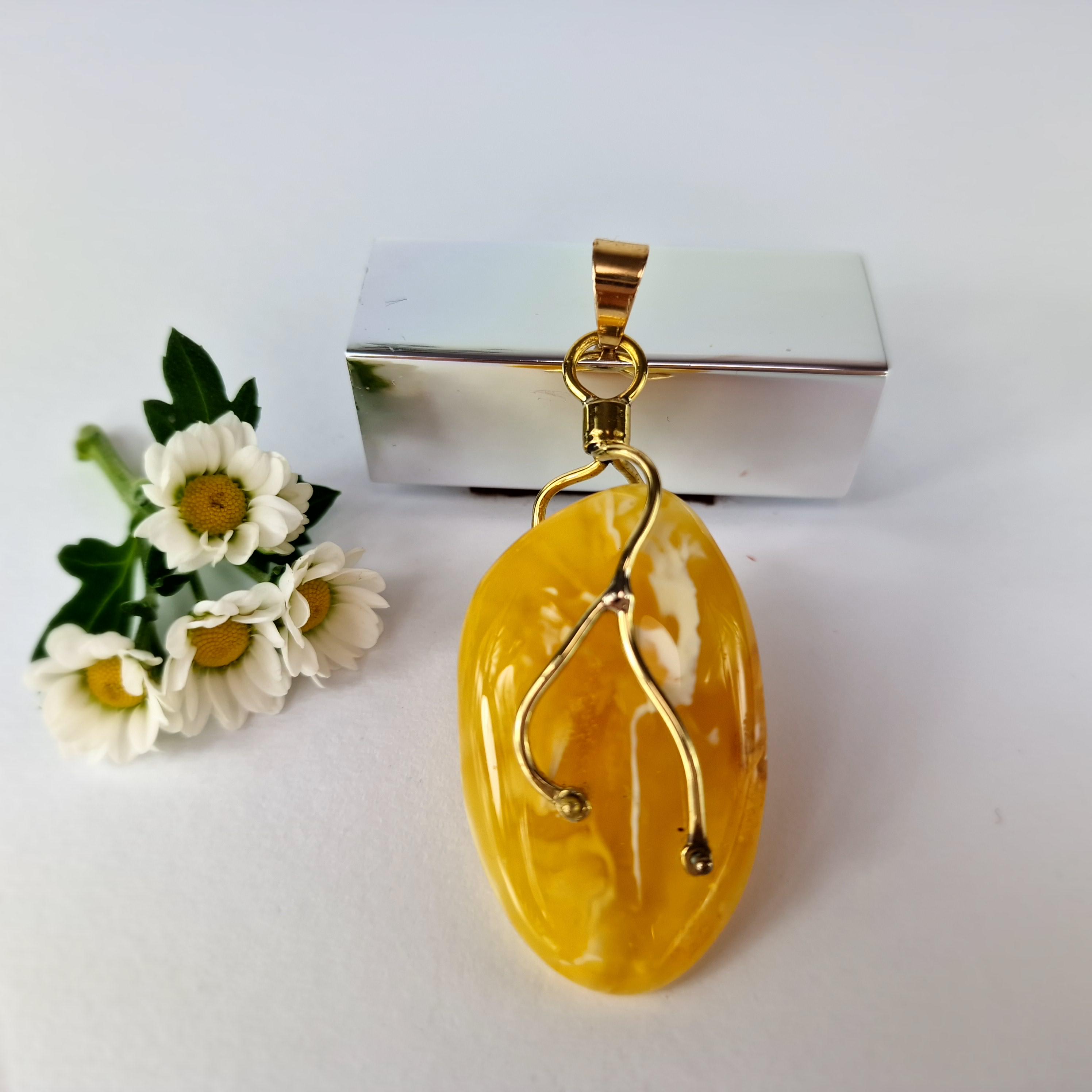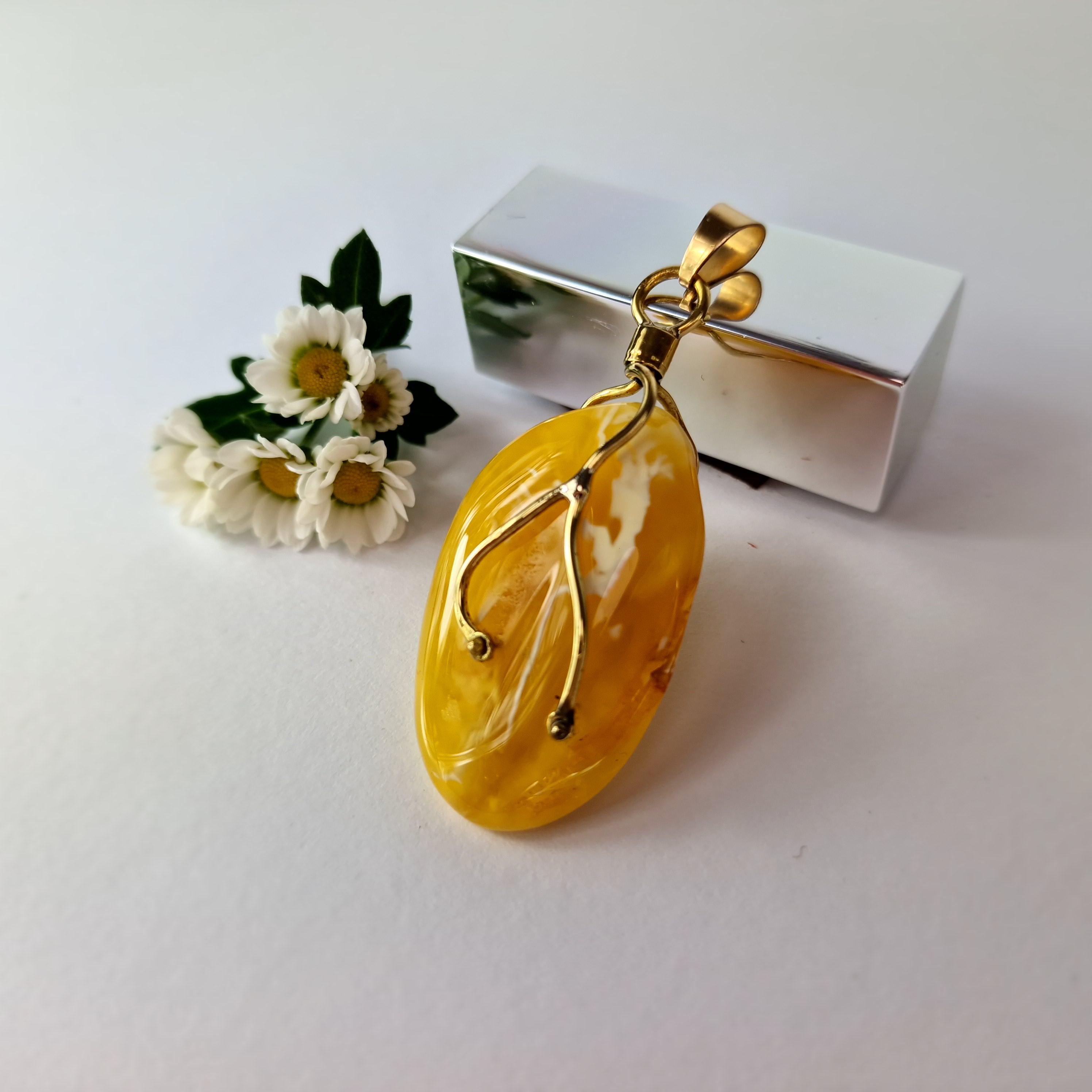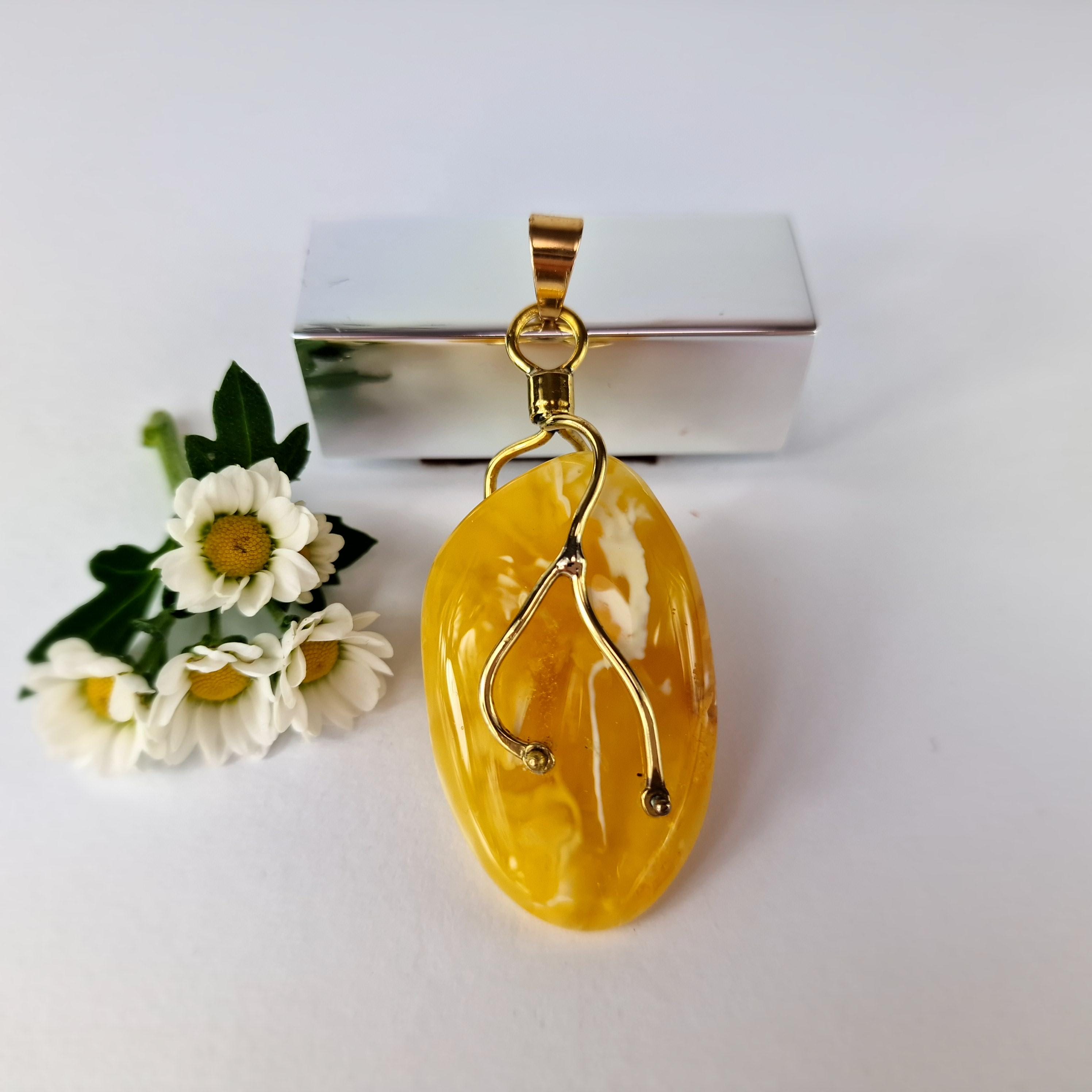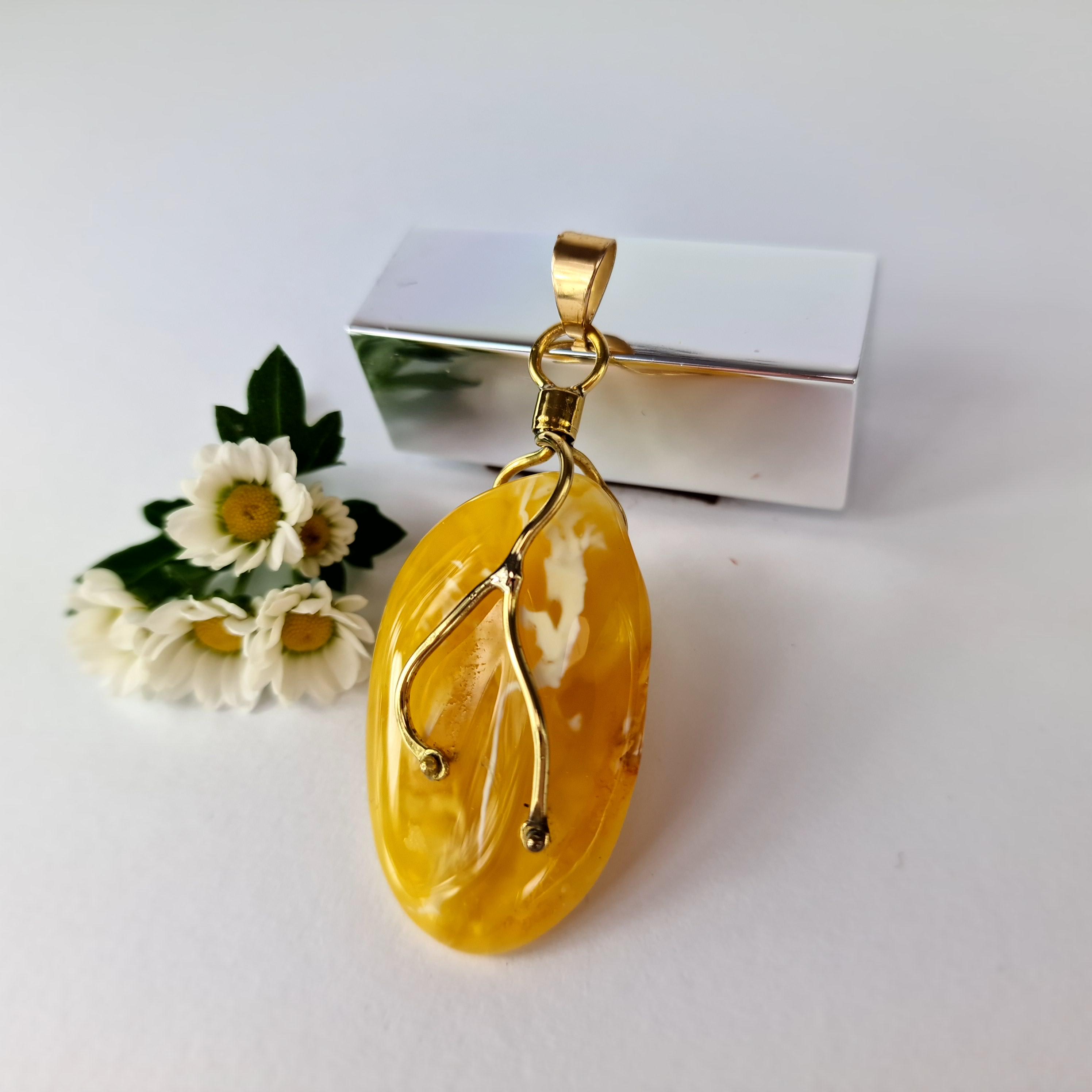 This is a medium-sized natural Baltic amber pendant. The yellow amber is framed in brass. The white cloud highlights the beauty of the amber. This pendant can be worn on a larger chain or on a solid hoop. It will suit best those who wear gold or gold-plated silver.