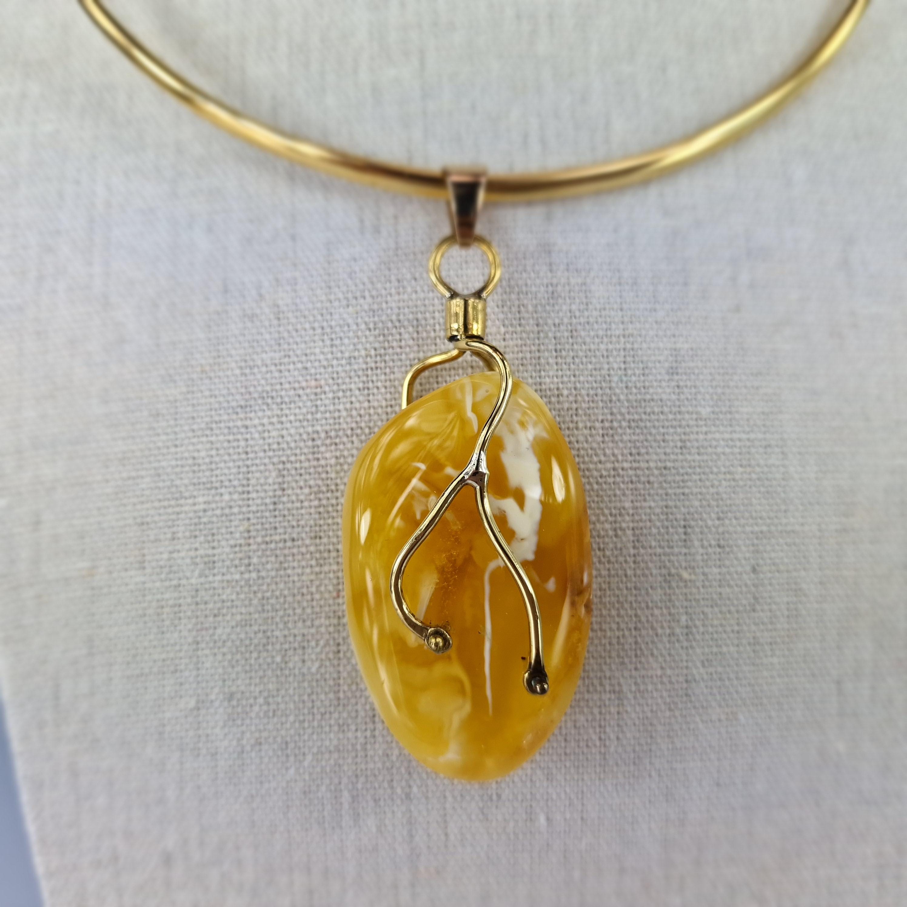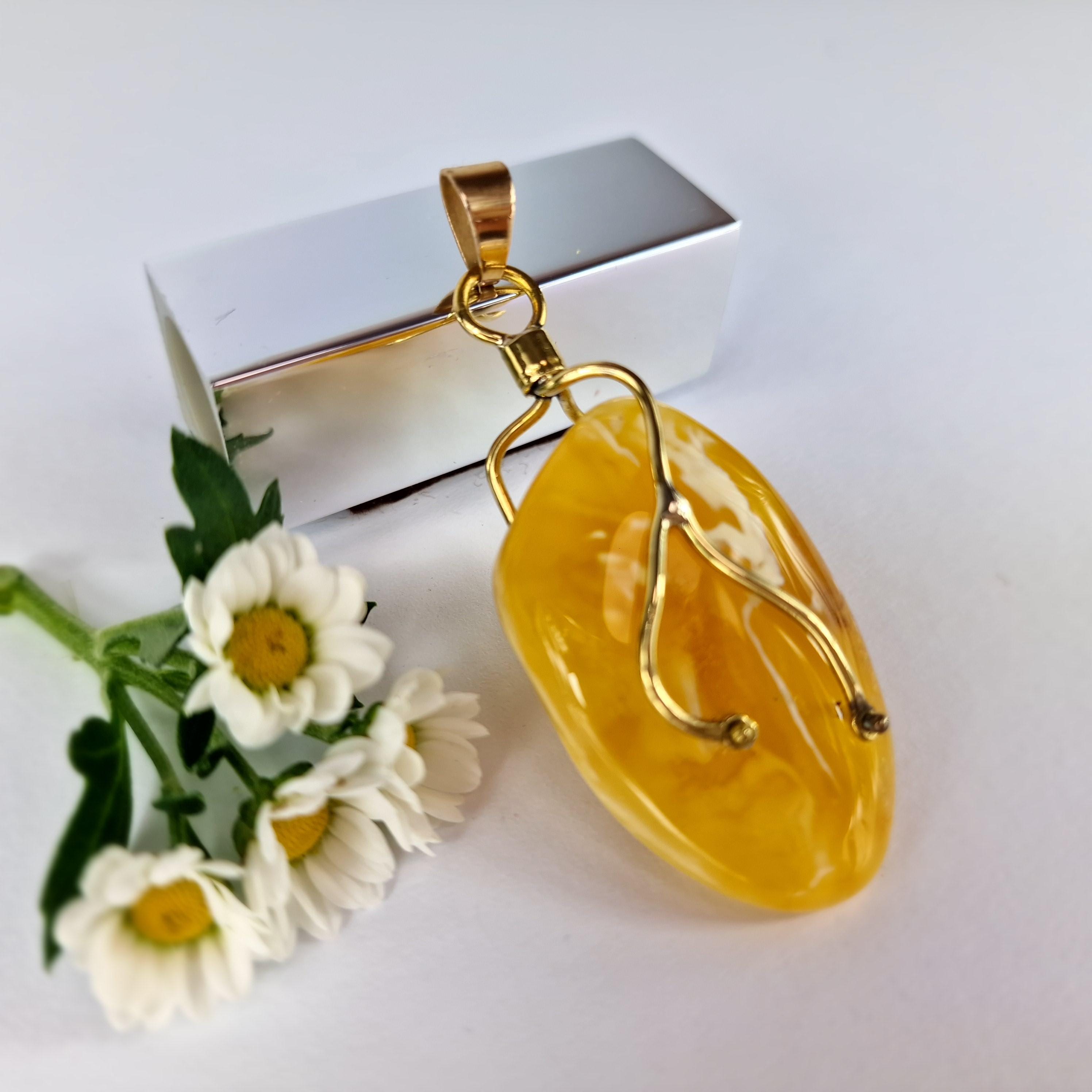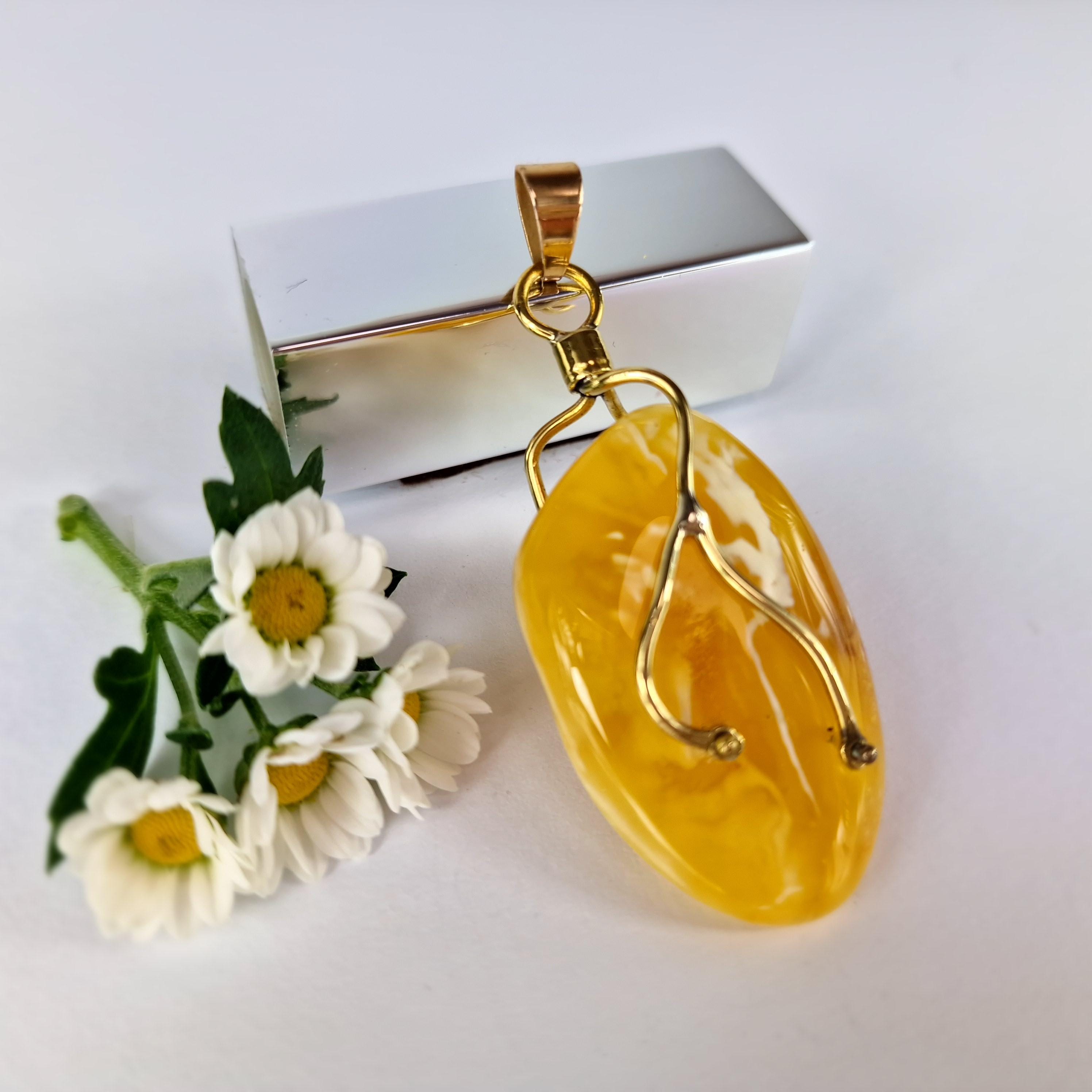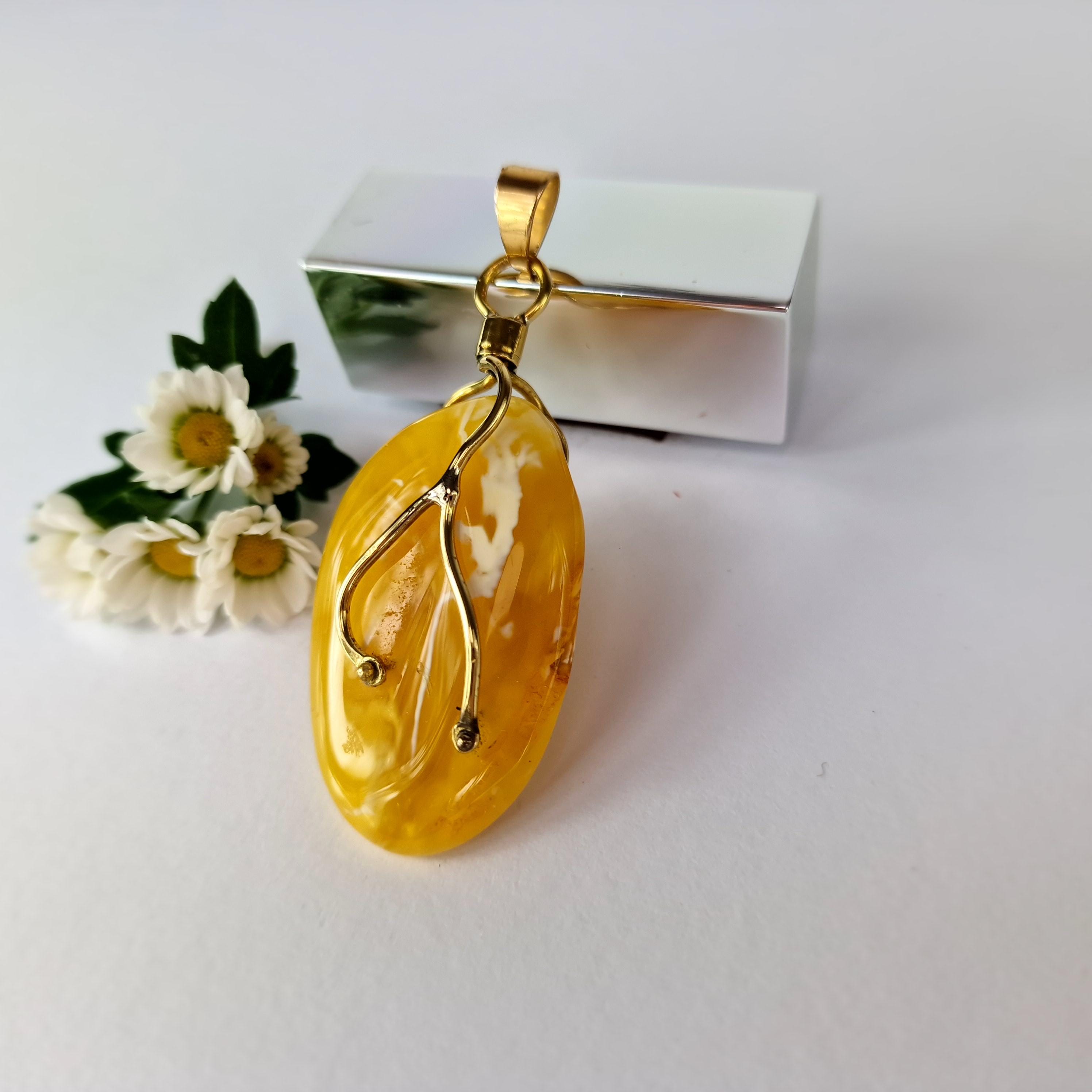 This is a medium-sized natural Baltic amber pendant. The yellow amber is framed in brass. The white cloud highlights the beauty of the amber. This pendant can be worn on a larger chain or on a solid hoop. It will suit best those who wear gold or gold-plated silver.