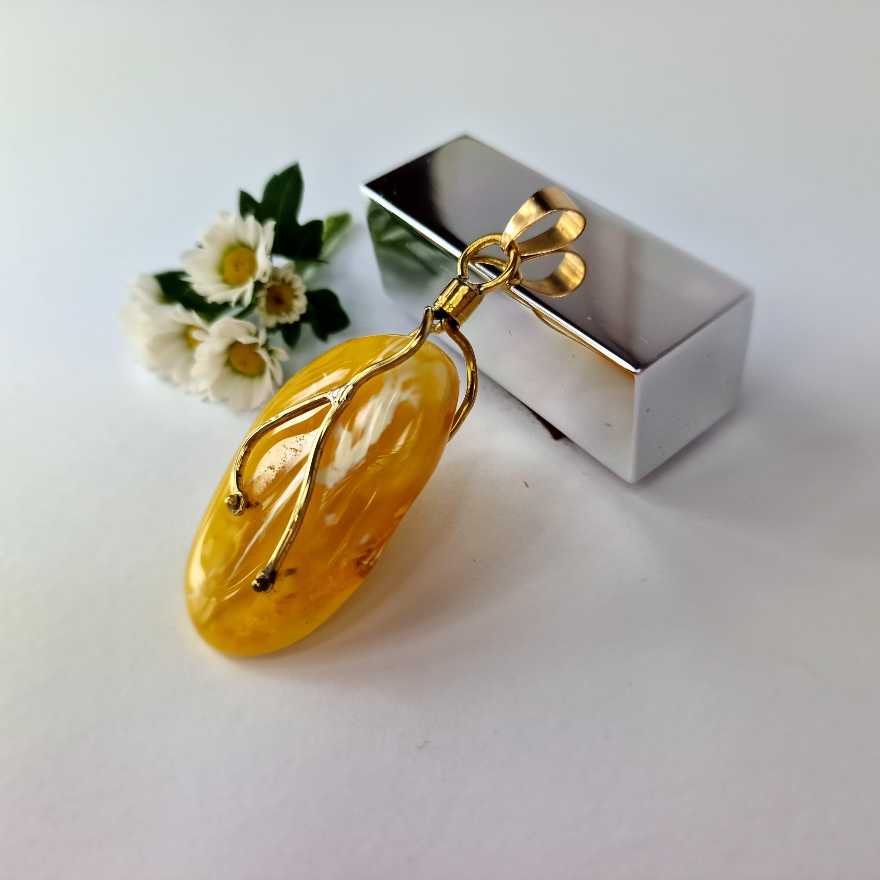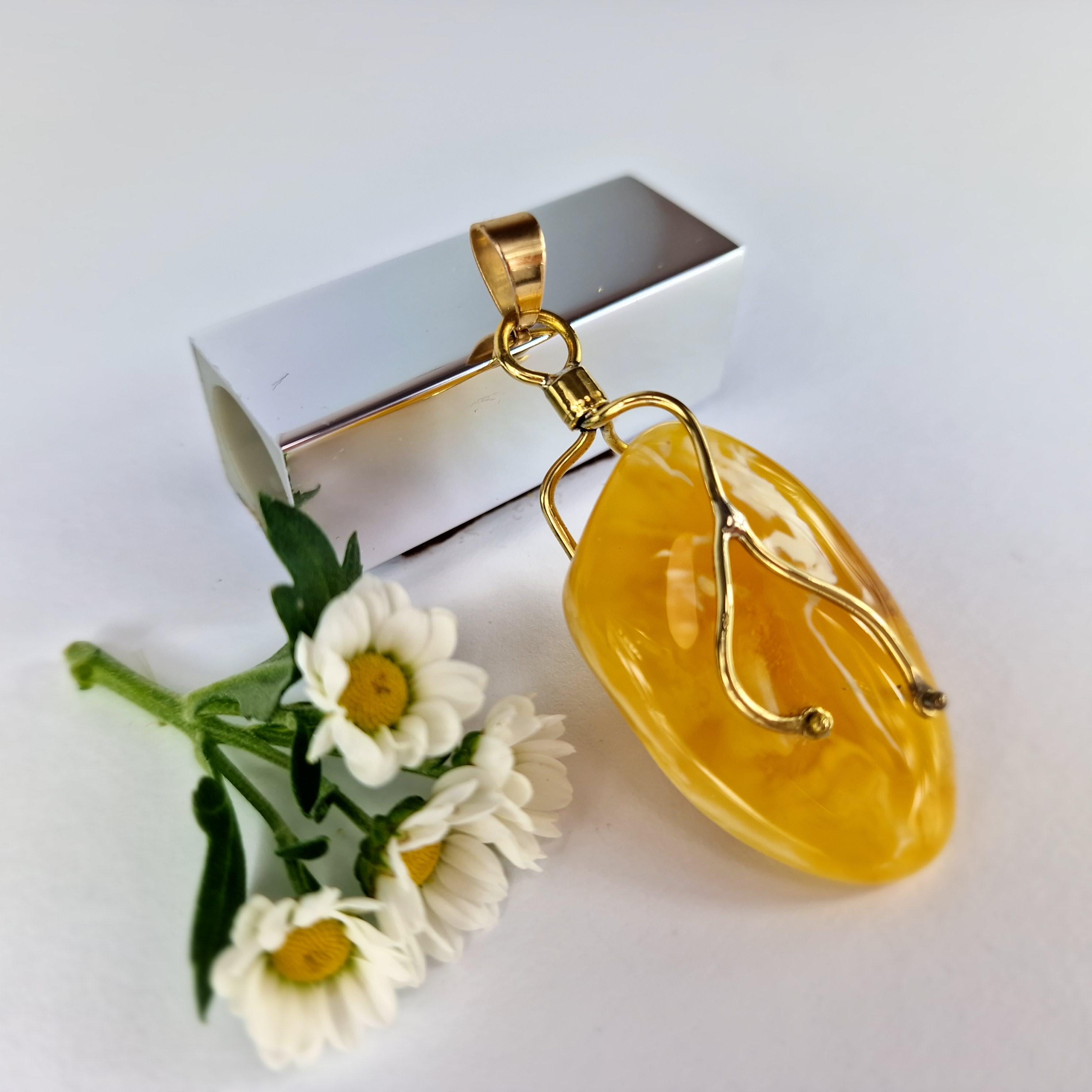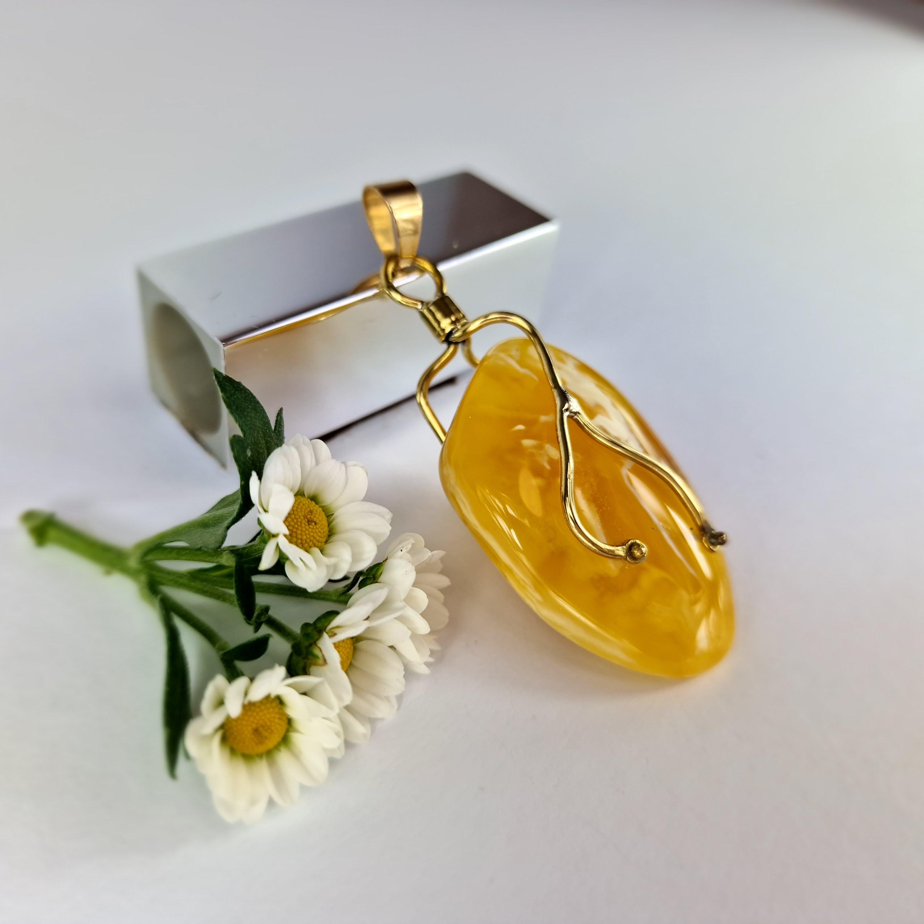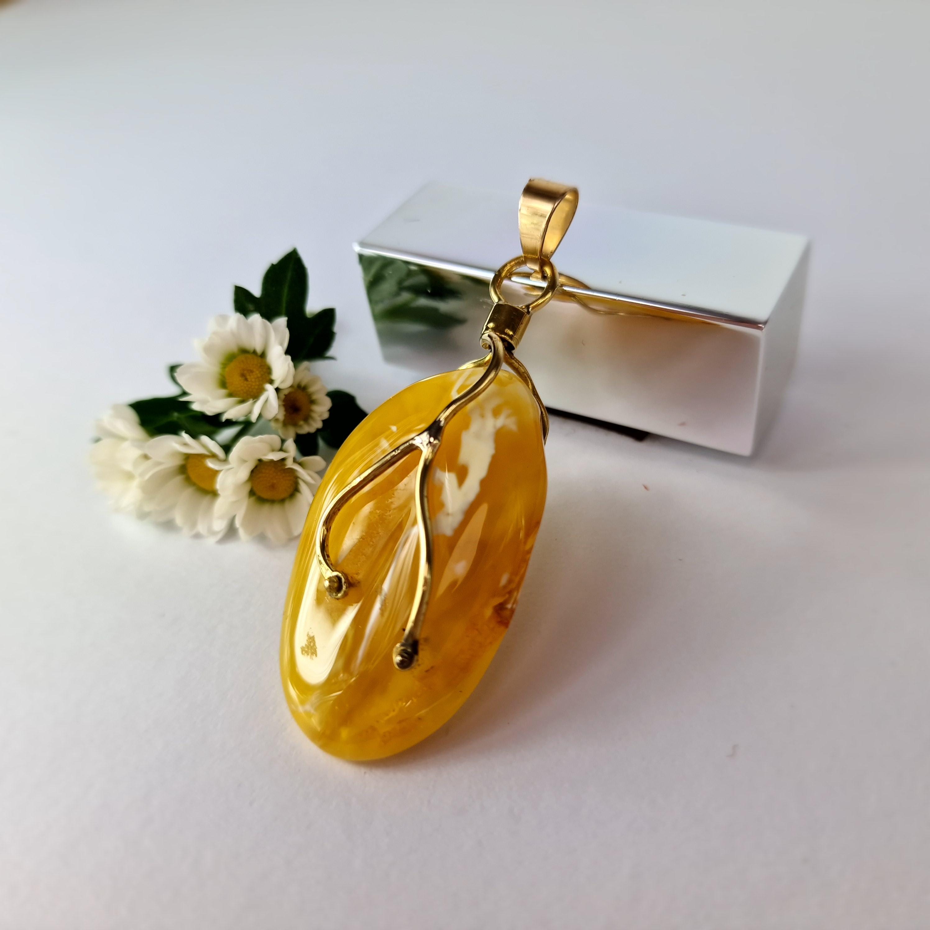 This is a medium-sized natural Baltic amber pendant. The yellow amber is framed in brass. The white cloud highlights the beauty of the amber. This pendant can be worn on a larger chain or on a solid hoop. It will suit best those who wear gold or gold-plated silver.
