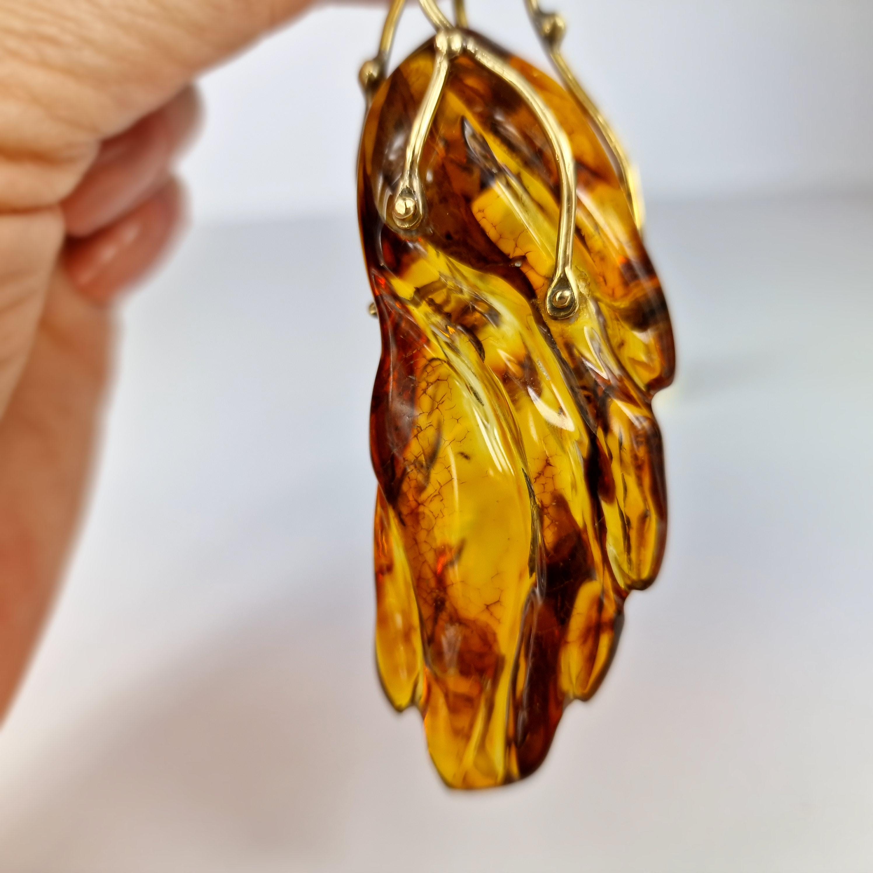 This is a large natural Baltic amber pendant. Cognac amber is framed in brass. The amber itself is slightly engraved, which gives the transparent amber charm. Such a pendant can be worn on a larger chain or on a hoop. It will suit those who wear gold or gold-plated silver best.