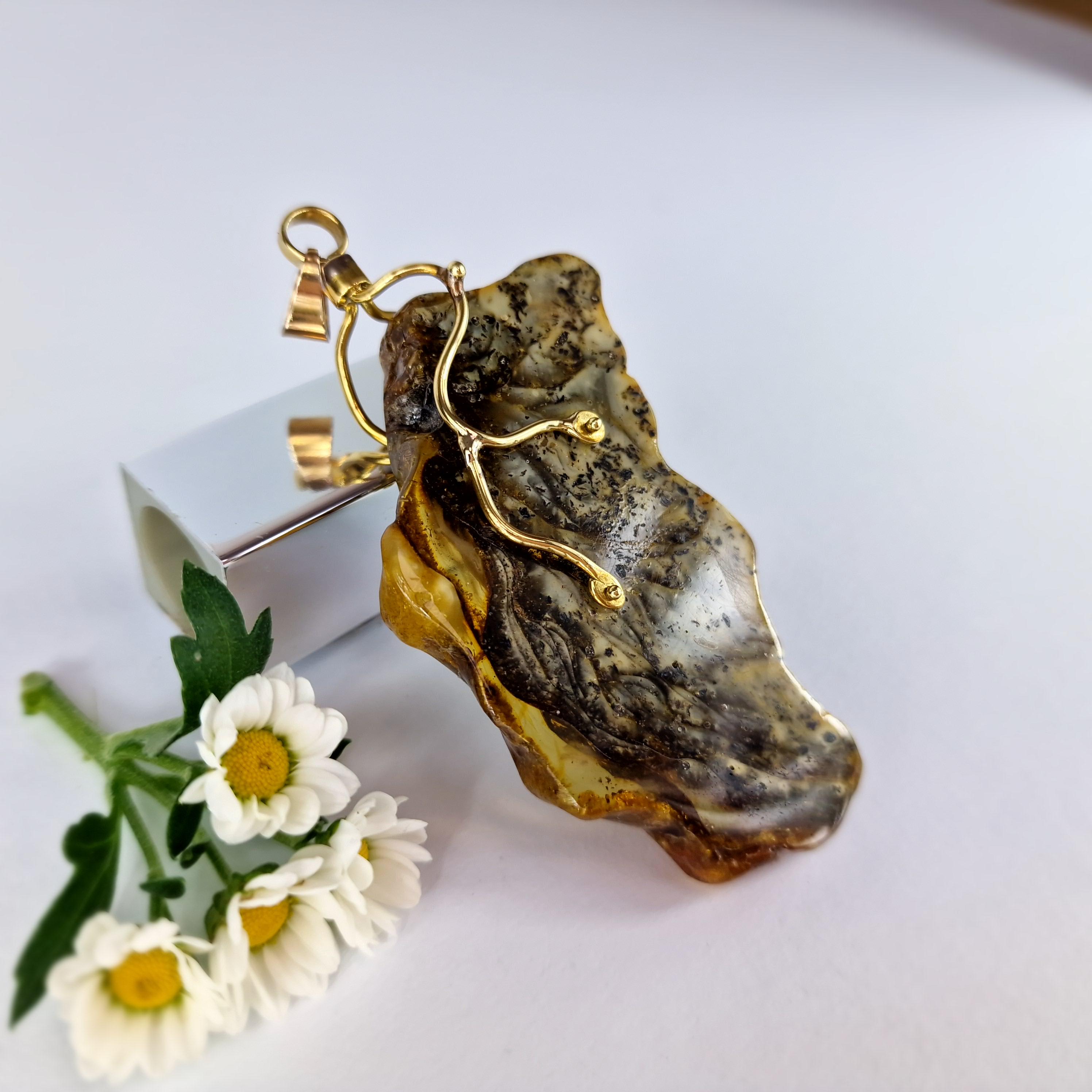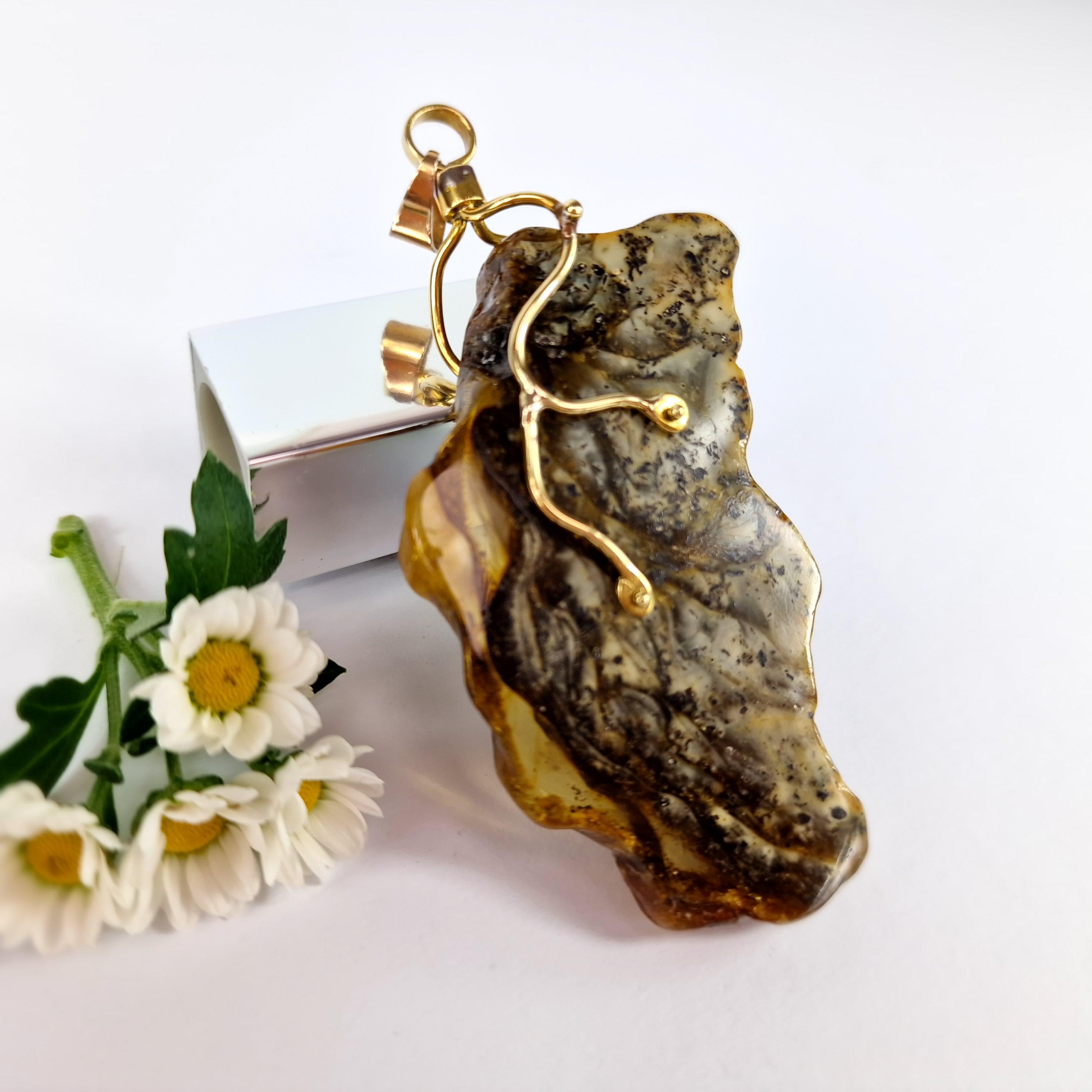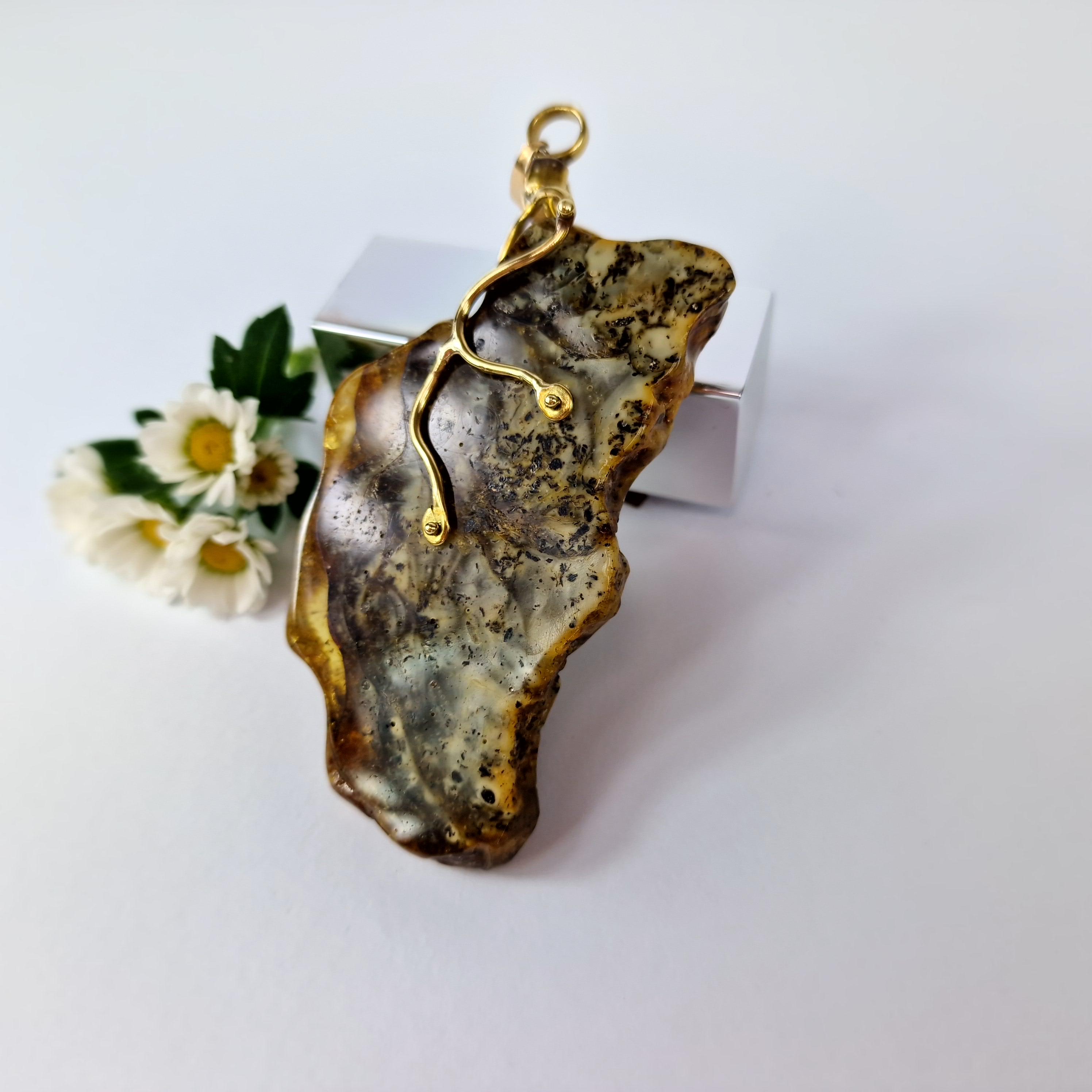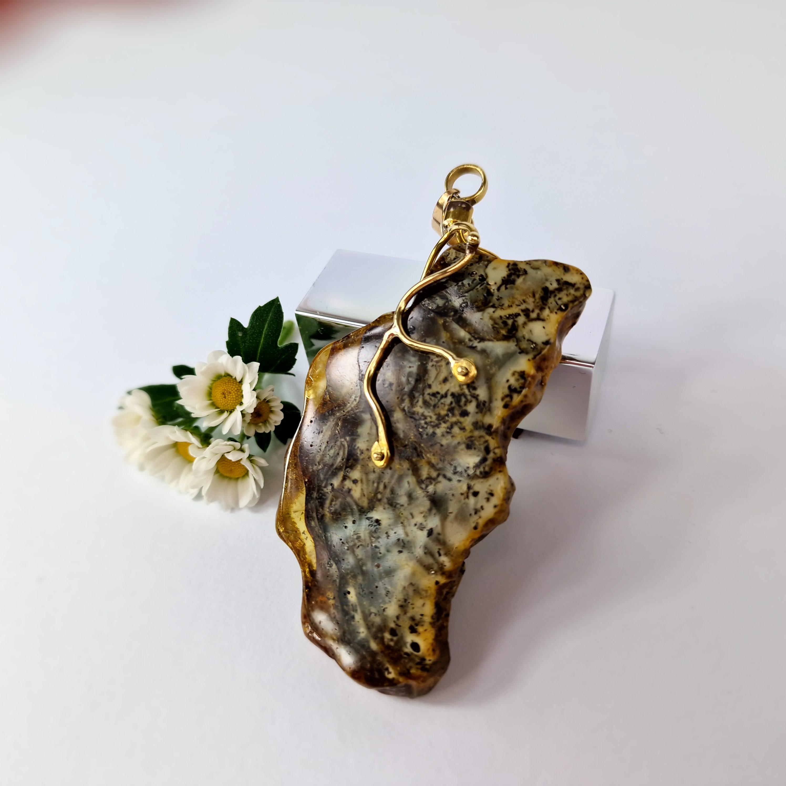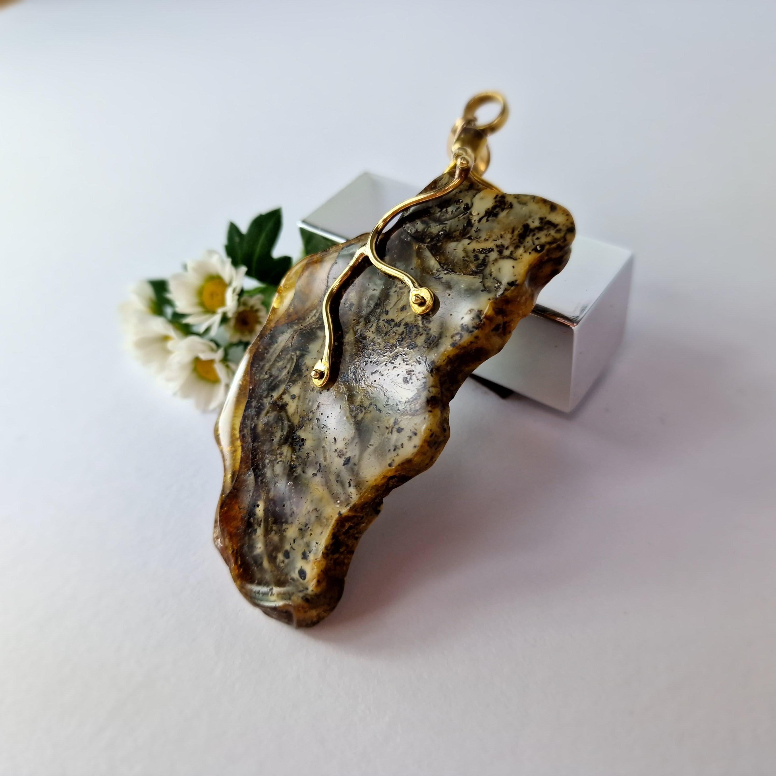 Rare Marble Amber Pendant, Huge Amber Pendant,Natural Amber Stone Bark,Grey Amber Necklace,Handmade Brass Pendant Gift,Baltic Amber Jewelry