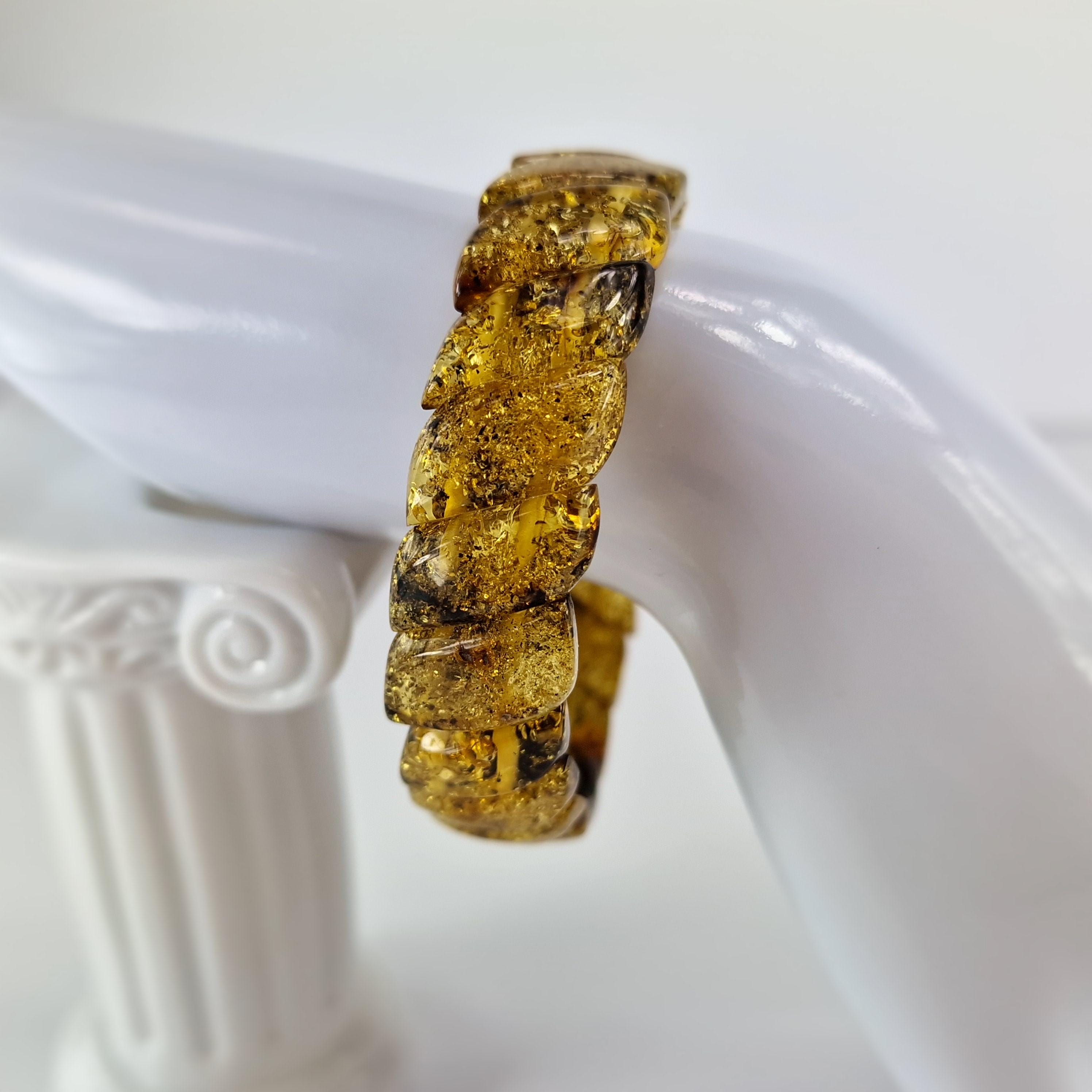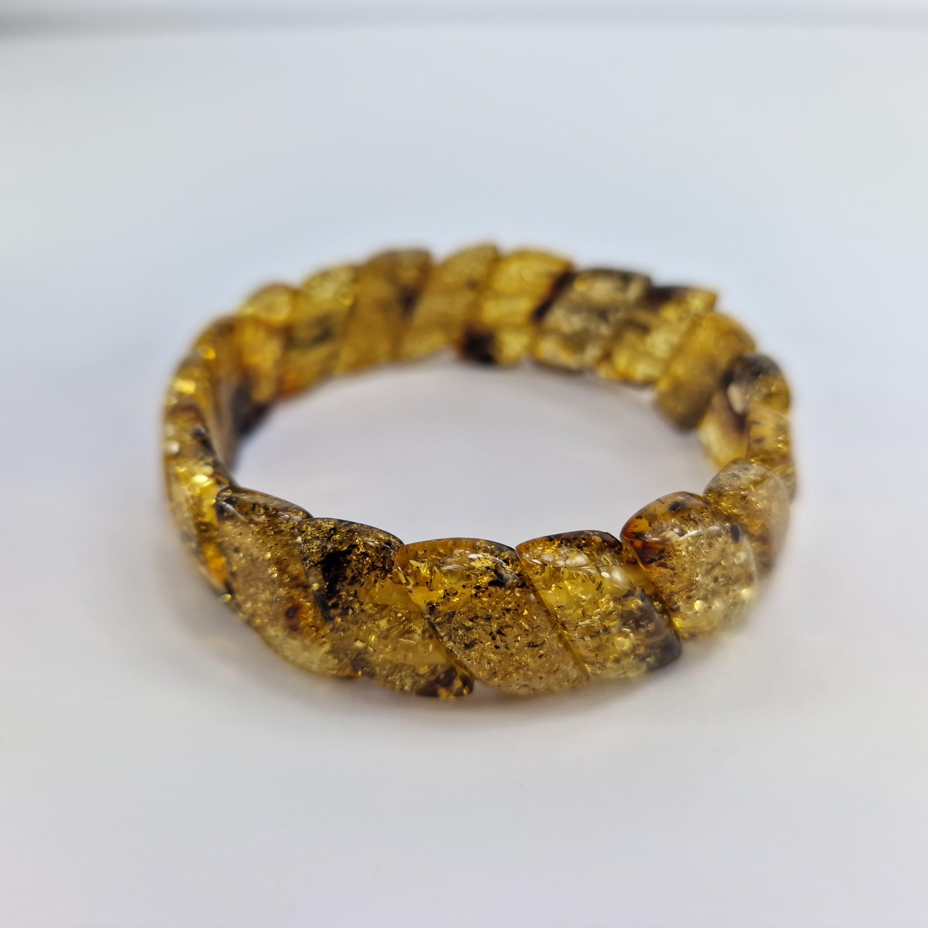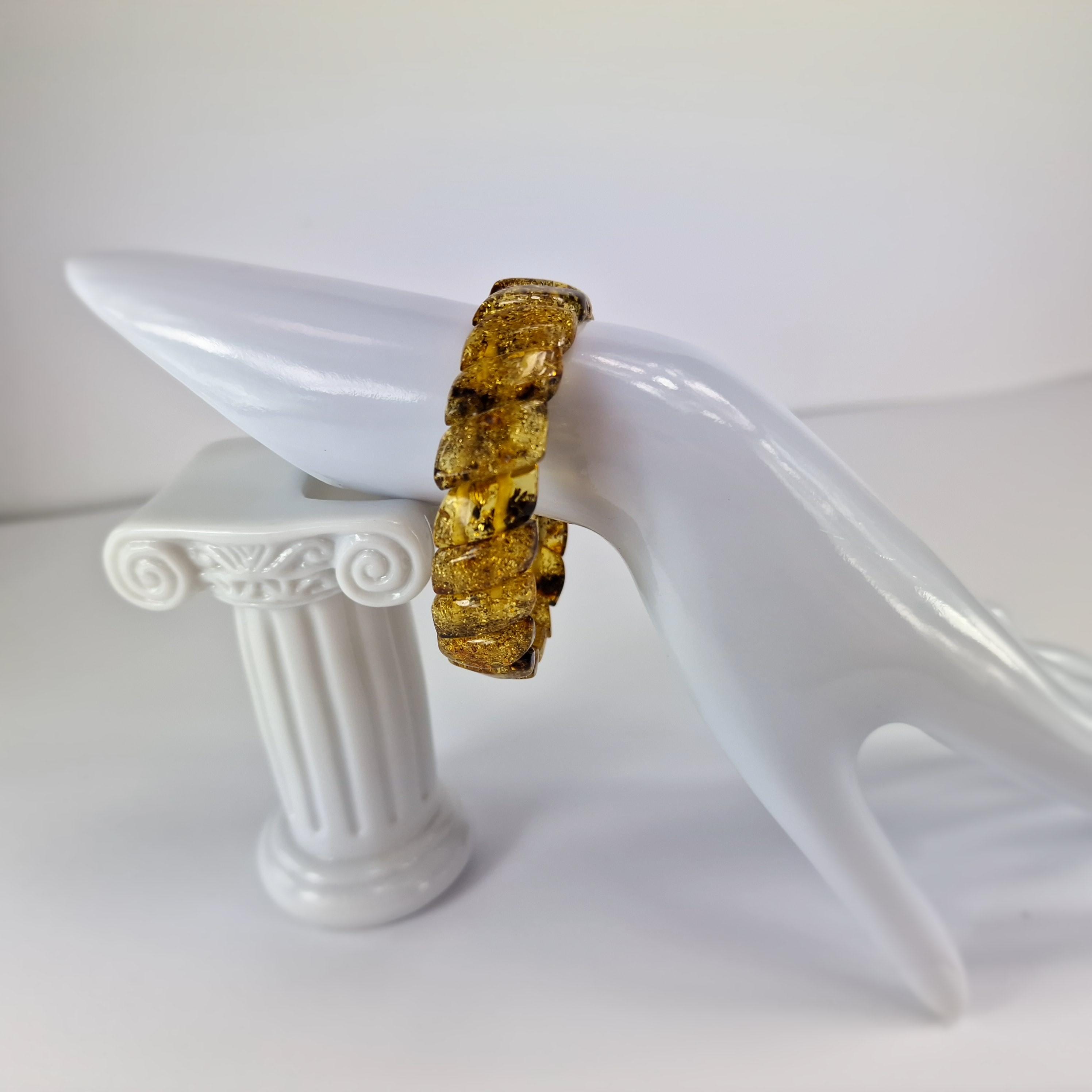 This is a small bracelet of light green Baltic amber. The transparent amber has a lot of small, glowing air flakes that shine in the light. The green color transitions into a golden reflection. The bracelet is all amber without metal. It is strung from two rows of rubber, which gives the bracelet elasticity.