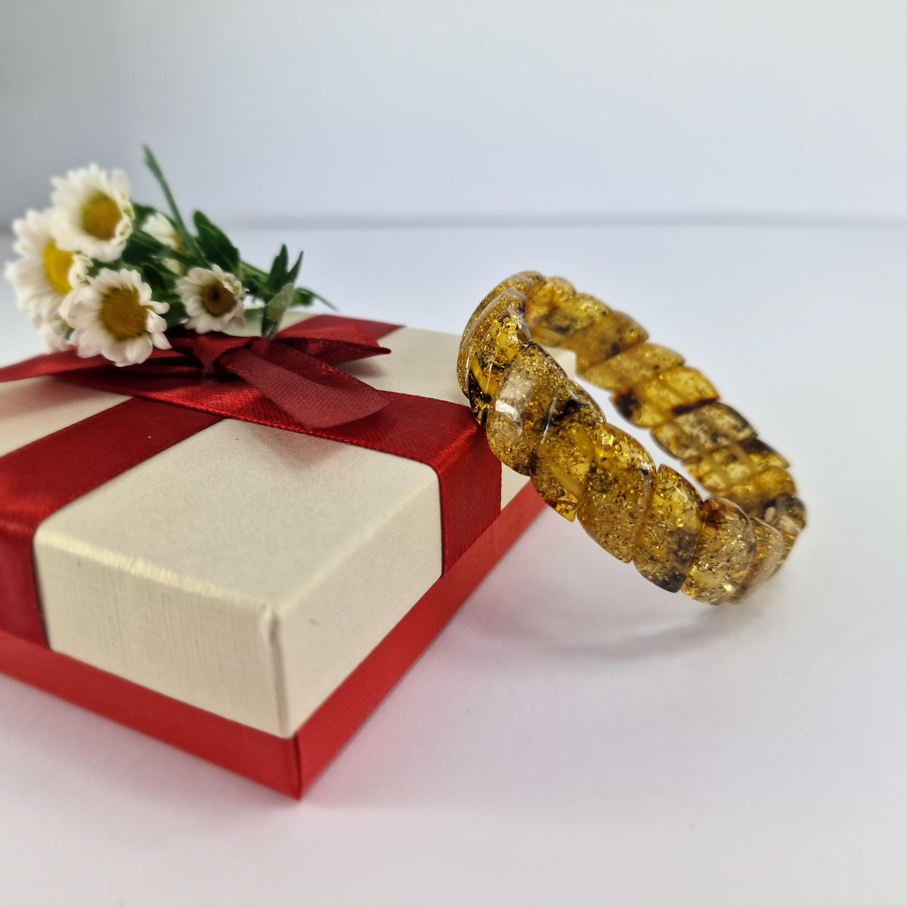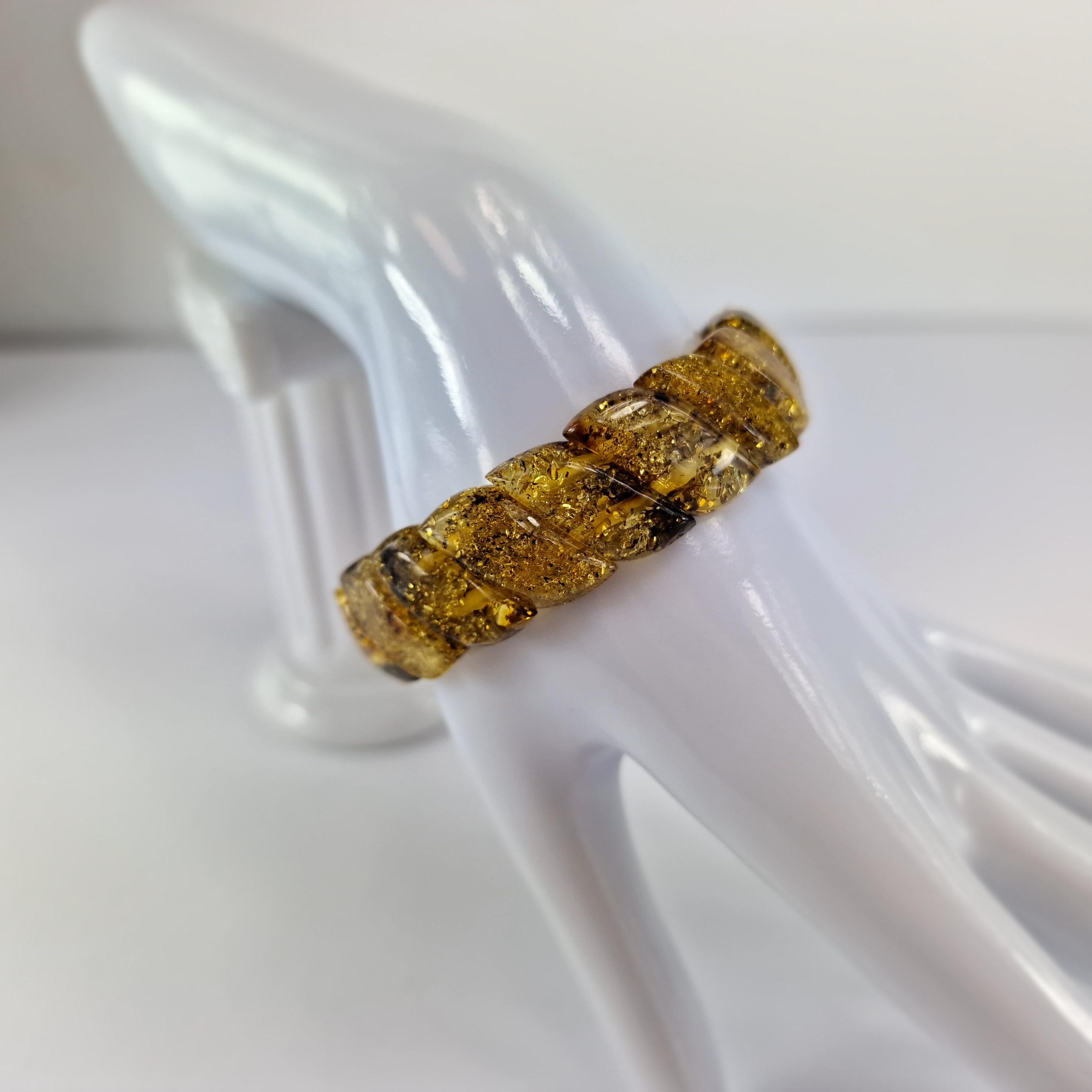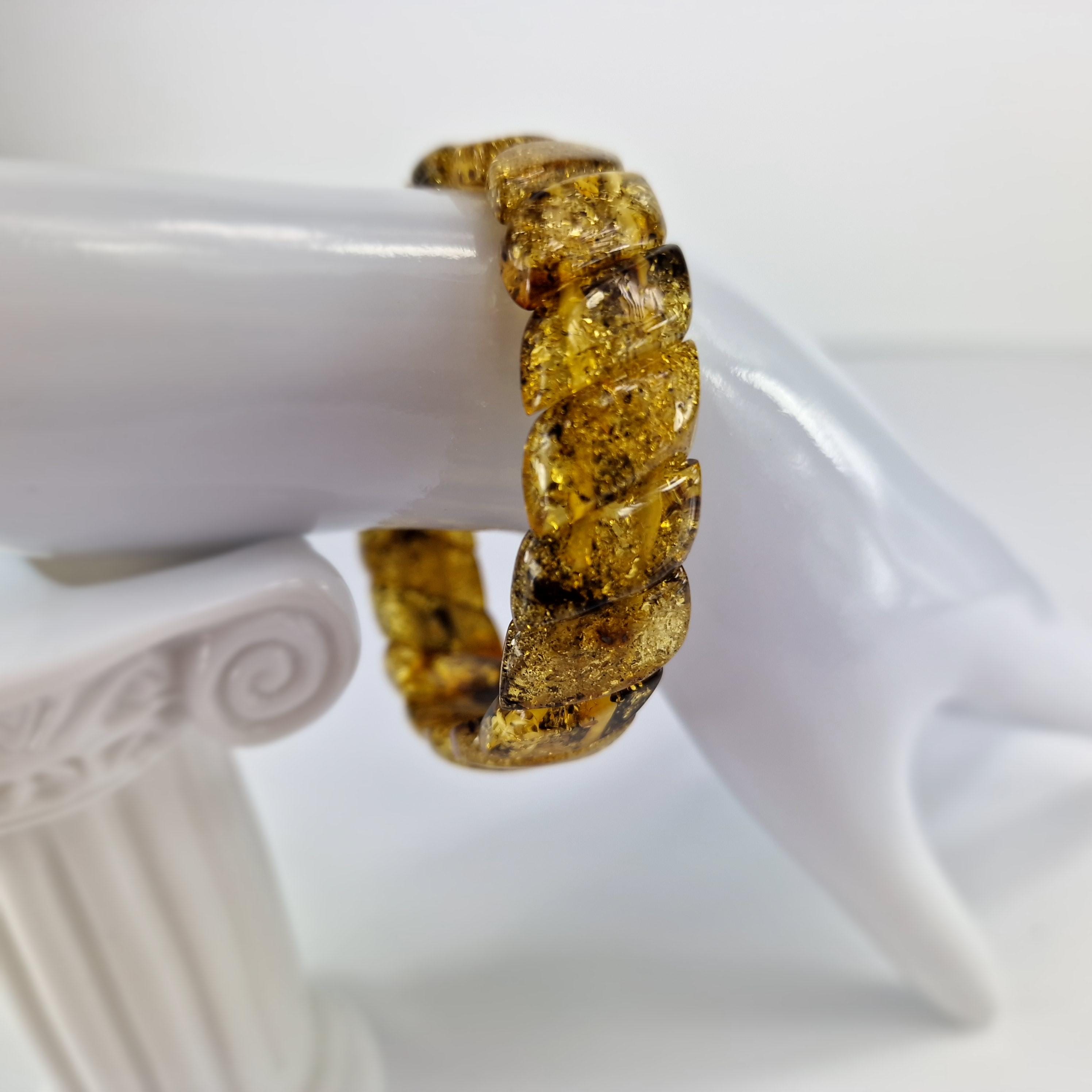 This is a small bracelet of light green Baltic amber. The transparent amber has a lot of small, glowing air flakes that shine in the light. The green color transitions into a golden reflection. The bracelet is all amber without metal. It is strung from two rows of rubber, which gives the bracelet elasticity.